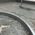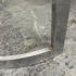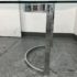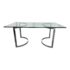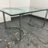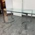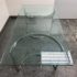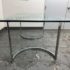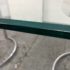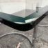 Design Plus Gallery presents a Vintage Glass Top with Chrome Crescent Pedestal Bases Table by Milo Baughman. A pair of chrome finish crescent pedestal bases with natural patina. The table top had a polish beveled edge with curved corners. One small chip on the edge. In good condition, visible and minimal wear from usage + age.