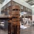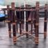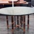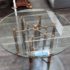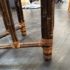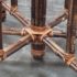 Design Plus Gallery presents a Genuine McGuire Round Dining Table with a Hexagonal Leather Laced base. The iron base is painted golden gate orange for authenticity and then covered with bamboo poles lashed together with leather rawhide laces. The top has an optional round, beveled pane of thick McGuire glass which is far more versatile than the hexagonal glass. Wear is consistent with its vintage age + use.