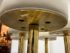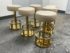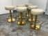 Design Plus Gallery presents a Set of Six Drake Counter Stools from Interlude Home. These Drake counter stools are topped in cream latte faux leather. The polished brass-finish brings together a retro silhouette with an industrial edge, plus the fun of a swivel. They are in good condition with minimal signs of wear from usage. Made in China.