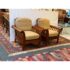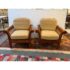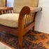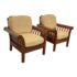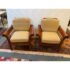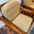 Design Plus Gallery presents a pair of Hickory Chair Company Arm Chairs. The pair has a slatted roll arm silhouette, formed by medium finished wood frame. A pair of tan linen upholstered, foam-filled loose cushions provide inviting comfort. Upholstery is not original; visible surface wear; condition is consistent with age and use.