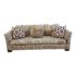 Design Plus Gallery presents a Cameron Collection Custom Down Filled Sofa. Bench quality manufacturing and down filled cushions make a sofa that will induce comfort and lasts a lifetime. Fabric shows wear from sun exposure and could use re-upholstery. Comes with coordinating graphic throw pillows for added punch! Current fabric on the sofa is a ribbed synthetic taupe blend. Unique cut out feature on the bench seat intersects into the curved arms. Curvature is continued into the chunky molded feet.