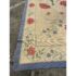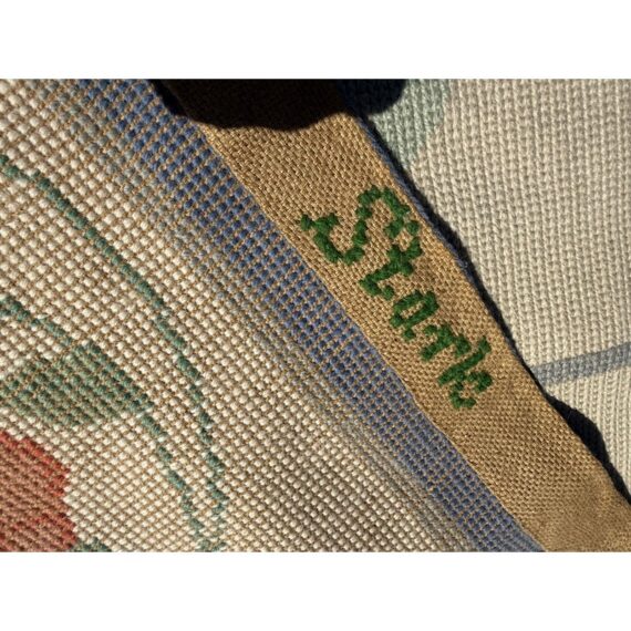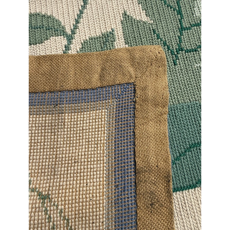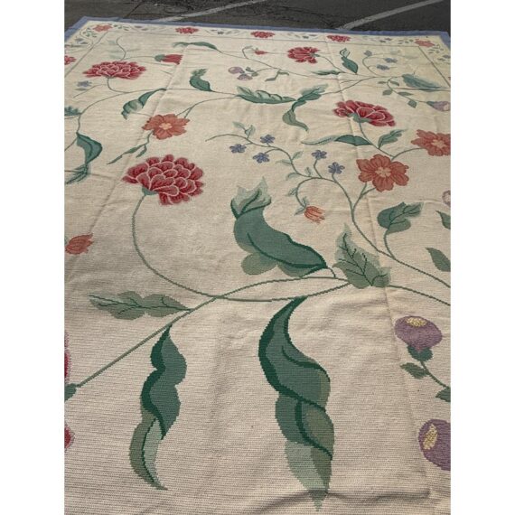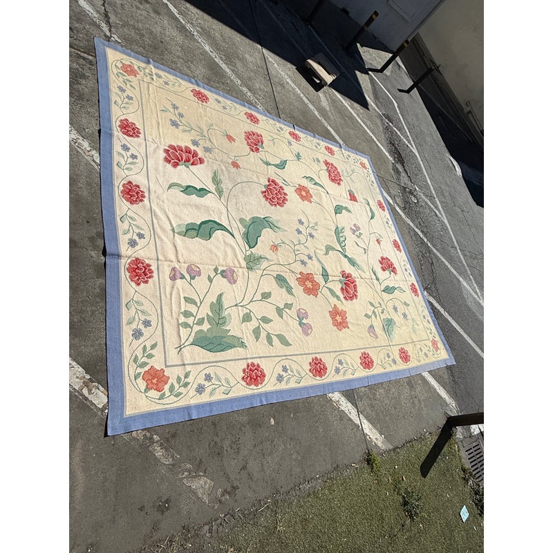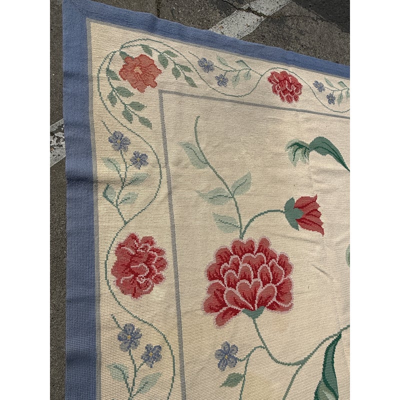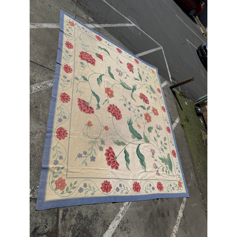 Design Plus Gallery presents an 11ft 8in × 13ft 11in Portuguese Petit-Point Area Rug by Starck. This custom 100% wool handmade area rug shows a pale cream field framed by a blue border, with scrolling floral motifs in shades of red, lavender, and green. The composition balances an open center with an abundant botanical pattern, while the petit-point weave gives the design a detailed, textured surface. Produced in 1991, this rug carries the distinctive line and scale associated with Starck. This is a discontinued model by Starck and is in good condition with visible and minimal wear from usage.