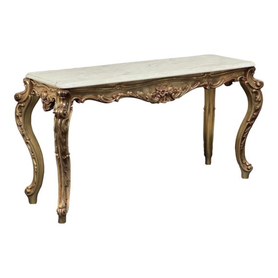 Design Plus Gallery presents a Console Table of Carved Gilt Wood and White Onyx in the 18th Century Style. The surface is of a natural onyx in a greenish white hue with turned out legs that have a strong neoclassical presence. Exquisite, elaborate and quite charming addition to your home.
