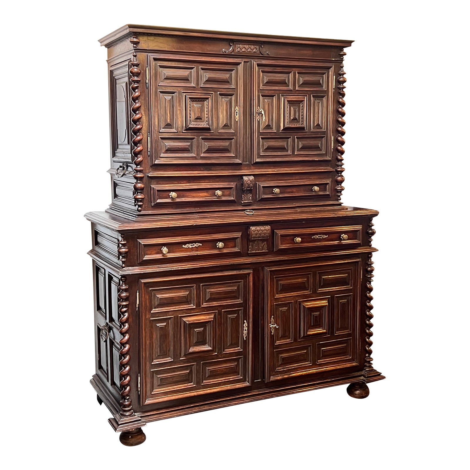 Design Plus Gallery presents a 18th Century Two Piece Flemish Cabinet. A stunning example of 18th-century craftsmanship. Made from solid woods, this antique cabinet showcases the skill and artistry of the time. The upper unit of the cabinet features two beveled front wood doors, which open to reveal a spacious interior. Additionally, there are two pullout drawers, perfect for storing smaller items such as silverware or table linens. The bottom unit also boasts two beveled front wood doors and two pullout drawers, offering even more storage space. The carvings on the frame further enhance the beauty of this piece, adding intricate details that catch the eye. There are metal lift handles on the sides of the top and bottom units. Whether used as a storage solution in a dining room or as a statement piece in a living room, this Flemish Cabinet is sure to impress with its timeless design and exceptional quality. Comes with a Key. In Antique condition. Visible and minor wear from usage + age.