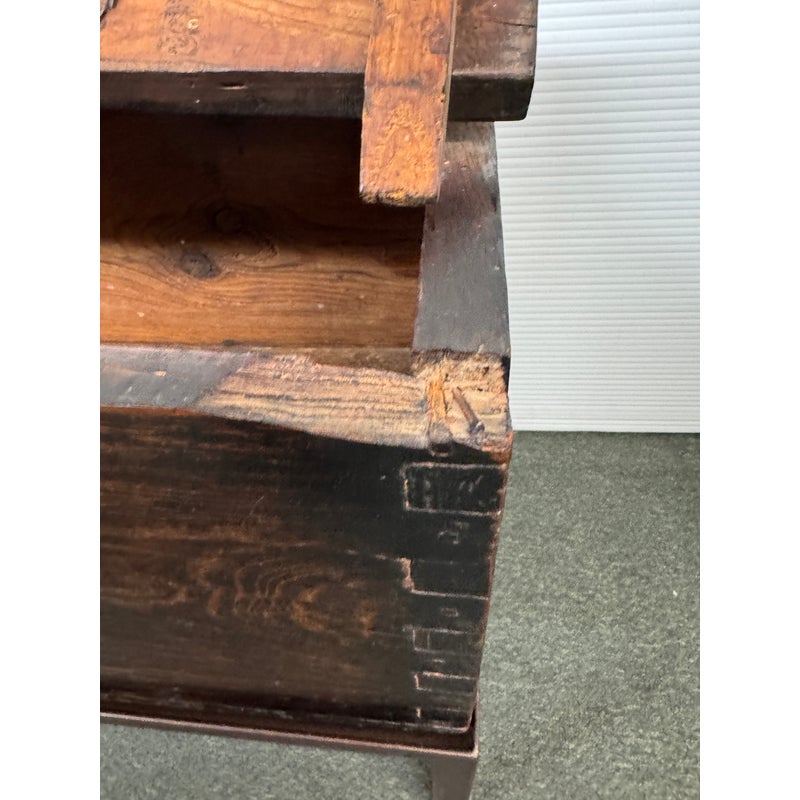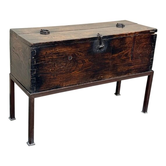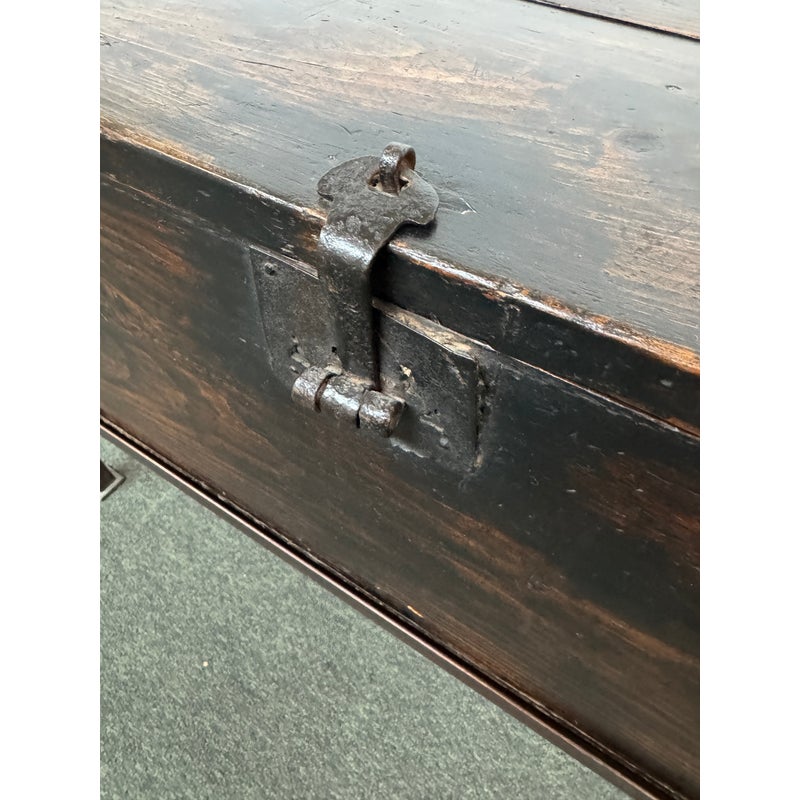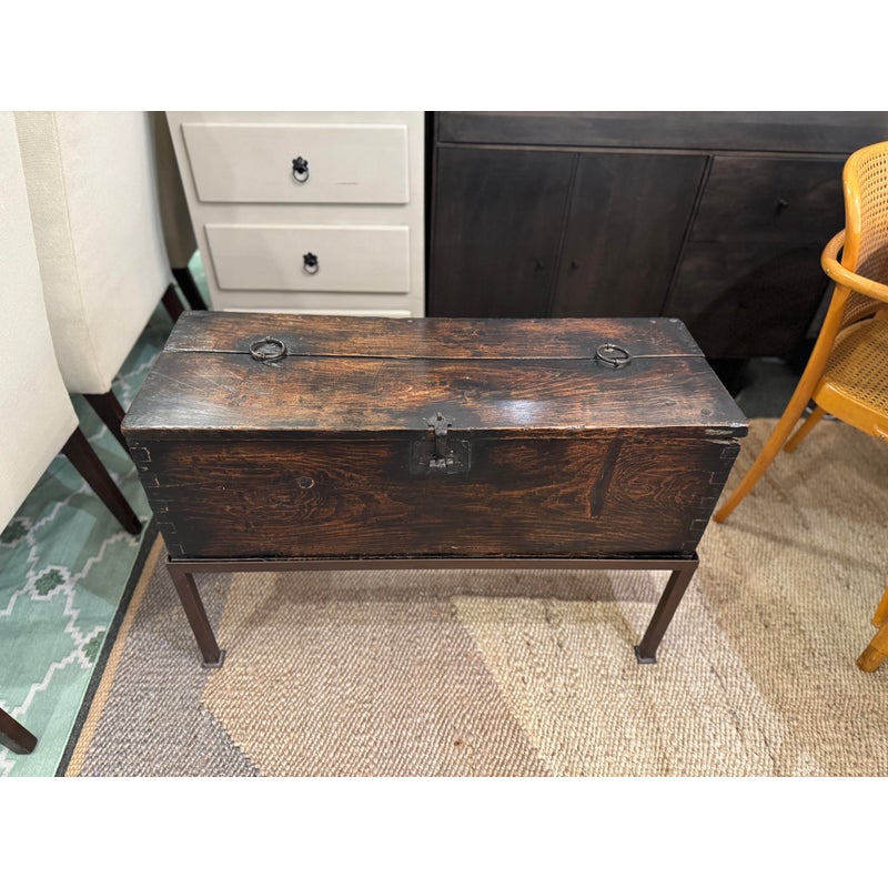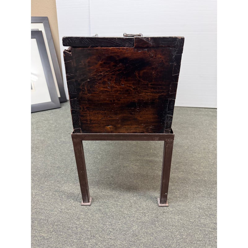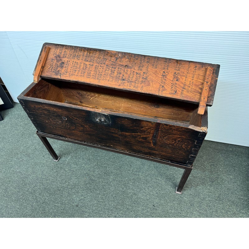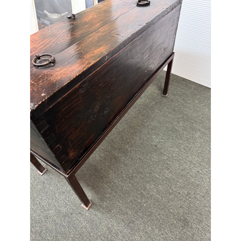 Design Plus Gallery presents an 18th Century Korean Coin Chest. Aged patina, original iron fittings, handcrafted details plus wonderful calligraphy creates a truly special “bank” for your treasures. Elevated for review and enjoyment by simple custom stand. Antique condition is good for age and use.