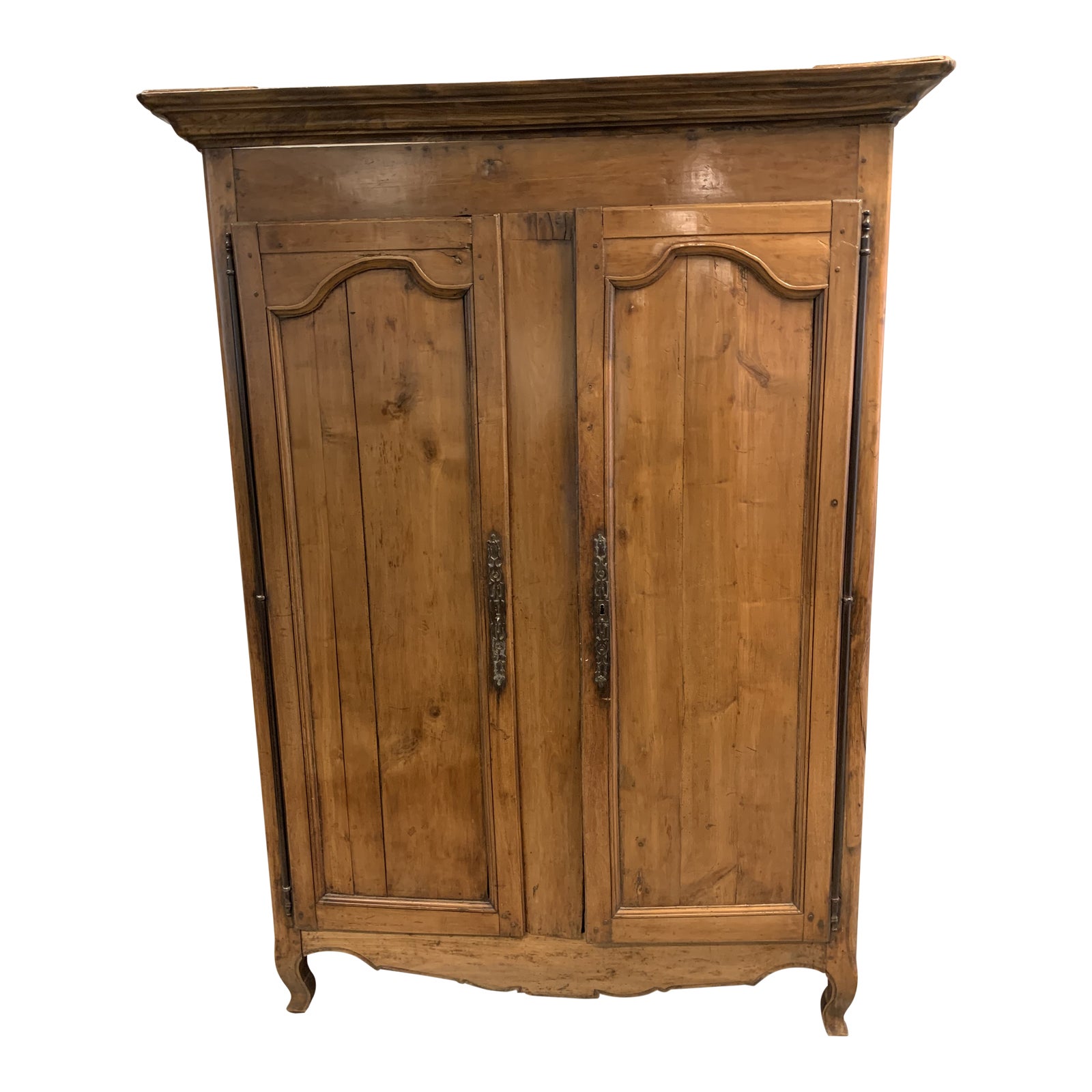 Design Plus Gallery presents a 18th Century French Fruitwood Armoire. Charming scrolling formations on the base mix with molding in this substantial storage unit. Doors open to reveal open storage with electrical cutouts on the top half. Left door has fastening latch on the interior of the armoire. Hardware for right door has a key hole but the unit does not include a key. Visible wear and cracks on the sides of the unit.