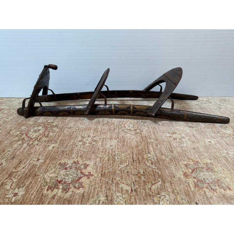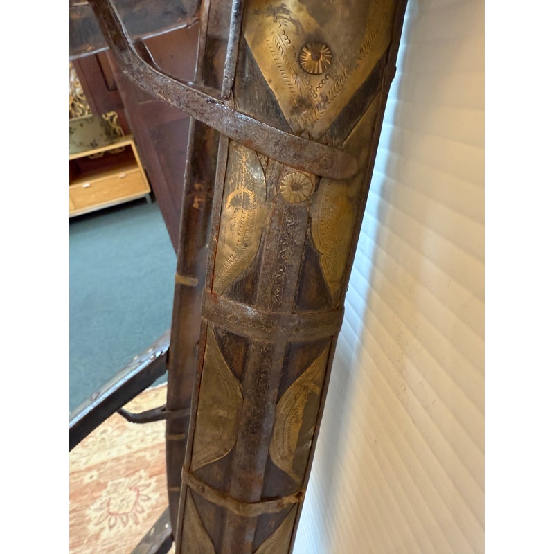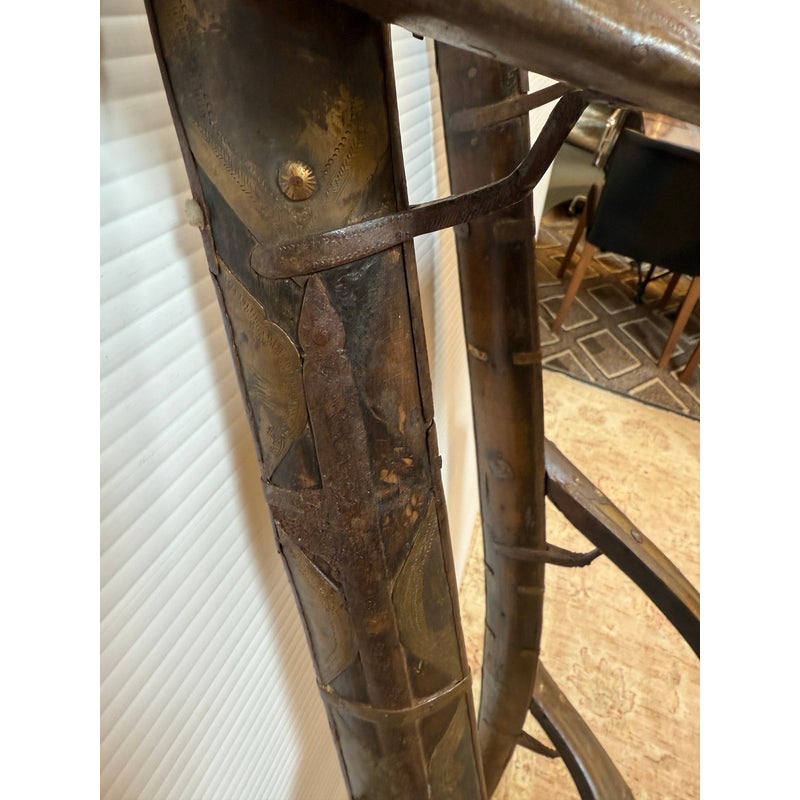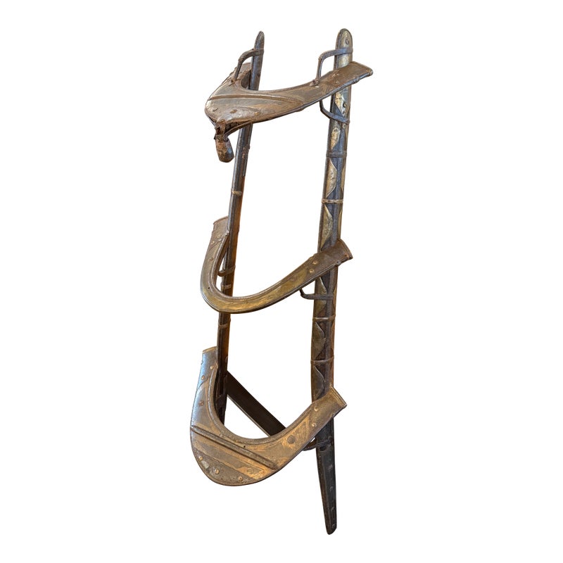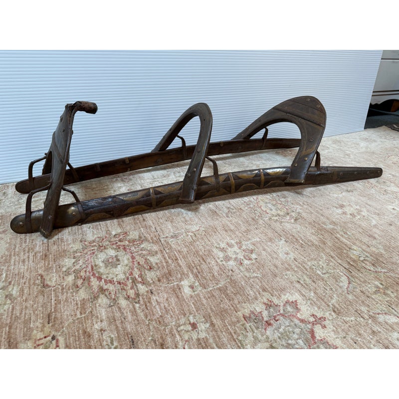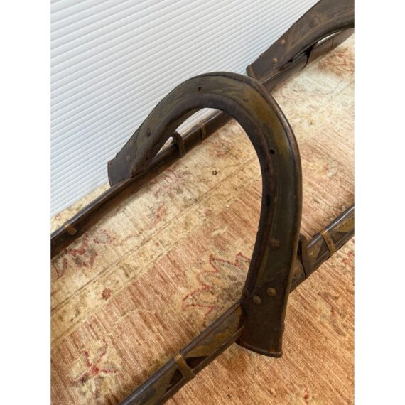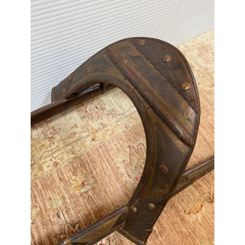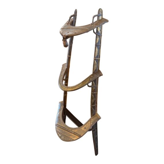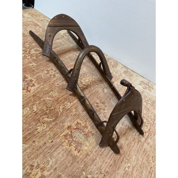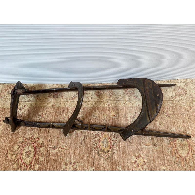 Design Plus Gallery presents a 18th Century Napoleonic Camel Saddle. This remarkable wood and brass camel saddle dates to the late 18th century and was specifically crafted for Napoleon Bonaparte’s famed Régiment des Dromadaires (Dromedary Regiment), which saw service during the Egyptian Campaigns of 1798 to 1801. Specially designed for the unique anatomy of the dromedary, or Arabian camel—with its single, prominent hump—the saddle was engineered to fit snugly around the hump, ensuring both stability and comfort for its riders. Constructed primarily of wood, the saddle is reinforced with robust iron fittings for strength and durability. The creation and use of such specialized saddlery epitomized Napoleon’s willingness to adapt and innovate in military logistics, enabling his forces to compete effectively in unfamiliar and challenging terrain. This camel saddle stands as a testament to that ingenuity and to the pivotal role of the dromedary regiment in the French campaign in Egypt. In good antique condition, visible distress and minimal wear.