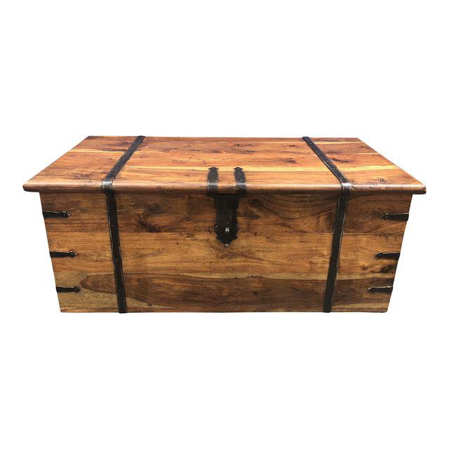 Design Plus Gallery presents a Cedar trunk. This Vintage piece is made of solid Cedar and is accented with Metal strapping and hardware that has dark finish. It has loads of character and can be used in many different settings whether it is used for storage or a coffee table or both.