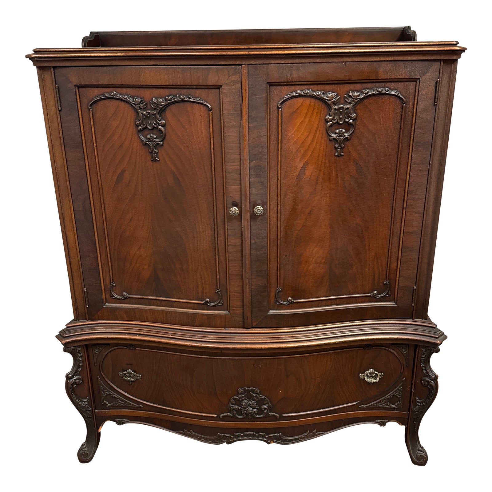 Design Plus Gallery presents a Petite Gentleman’s Dresser from the 1920. Beautiful aged mahogany wood with ornamental details all around the front and one the sides too. The upper two cabinet doors swing open to reveal five inner shelves that are encased and discreetly hidden. The outer portion holds one other bottom drawer. Is in good condition with visible and minor wear that is consistent with its age + use.