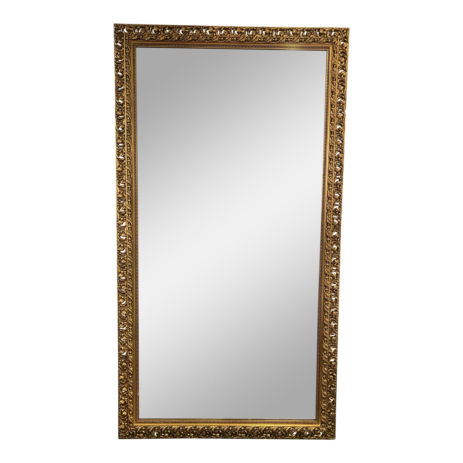 Design Plus Gallery presents a large Gilt Framed Mirror. Large enough to stand or lean, the intricately carved framed piece is fitted to hang horizontally.Delicate flora allows light or wall color to peek through.