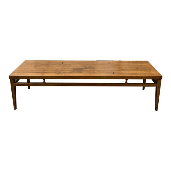 Design Plus Gallery presents a Wood Coffee Table by Lane Furniture. The tabletop is rectangular and constructed with four planks. Seven dovetail joineries are used as accents. the legs are square with a taper. The table apron features hourglass-like accents that connect the top to beams. Style Number is 0921-01. Serial Number is 950260. Minor wear from age and use; table is in good condition.