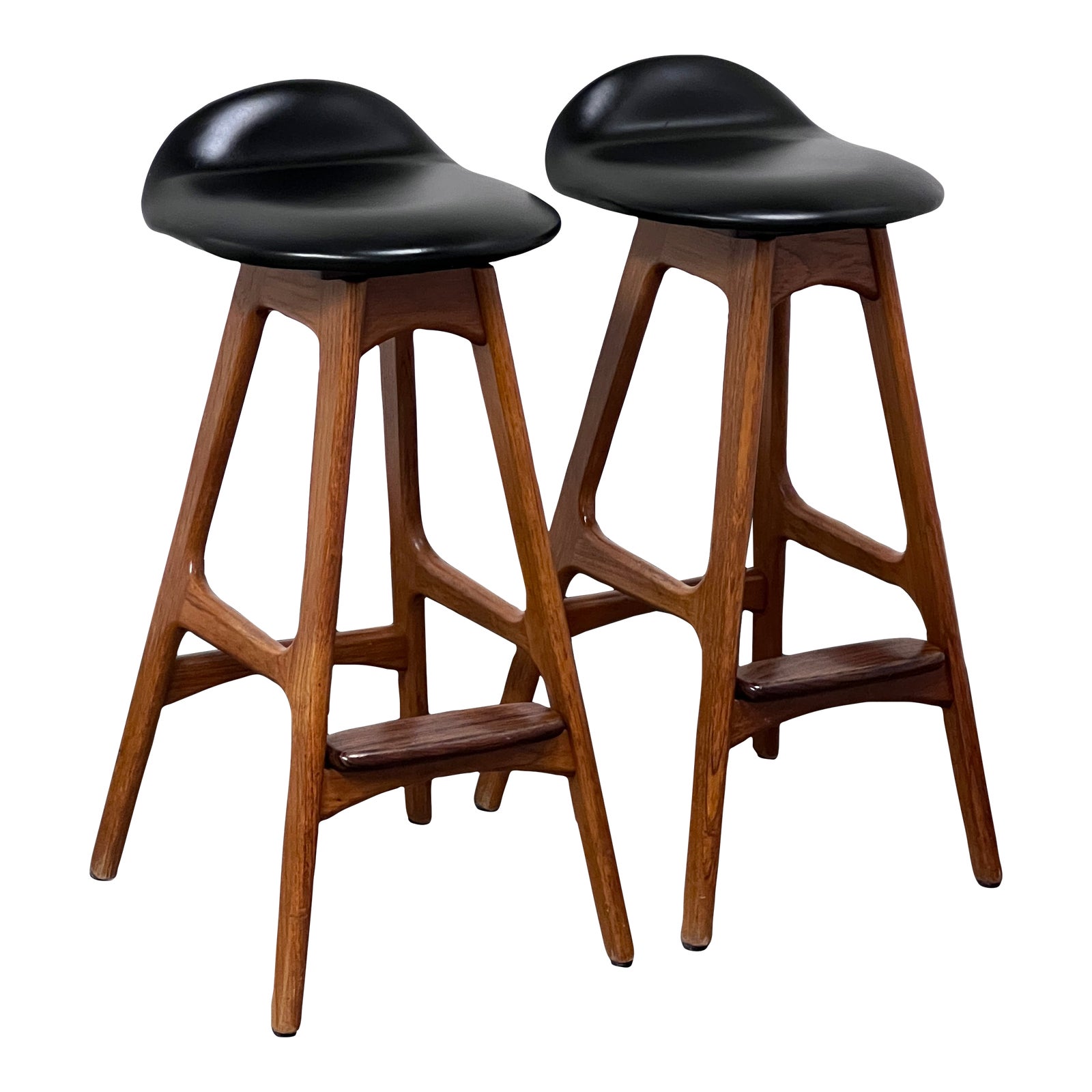 Design Plus Gallery presents a Pair of Bar Stools by O.D. Mobler. Designed by the renowned Danish designer Erik Buch. These bar stools are a true testament to Buch’s skill and craftsmanship, showcasing his distinct Scandinavian style. The seat of these counter stools is made of black aniline leather, providing both comfort and durability. This specific model can be quite hard to find, making it a true collector’s item. The fact that these stools were designed by Erik Buch and produced by O.D. Mobler adds to their desirability and investment value. Erik Buch, born in 1923 in Copenhagen, was a Danish industrial designer renowned for his use of wood and his functional yet organic aesthetic. His love for craftsmanship and attention to detail is evident in every piece he created, including his chairs, stools, and cabinets. With their sleek design, high-quality materials, and scarcity, these counter stools are not only functional seating options but also works of art. Visible and minor wear from usage + age. Made in Denmark.
