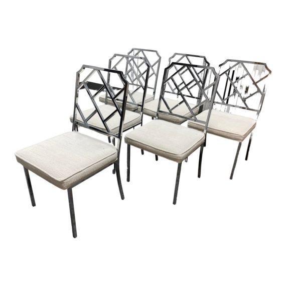 Design Plus Gallery presents a Set of Six Chrome Chippendale Side Chairs by Design Institute of America (D.I.A.). Designed by Milo Baughman in the 1970’s for D.I.A.. The chairs are chrome plated steel with minor patina. The seats are upholstered in a off white fabric. The modern chrome Chippendale chair was a clever way of melding a traditional design with a new element for an absolute original and stunning design. The seats can be reupholstered easily. Made in the United States.