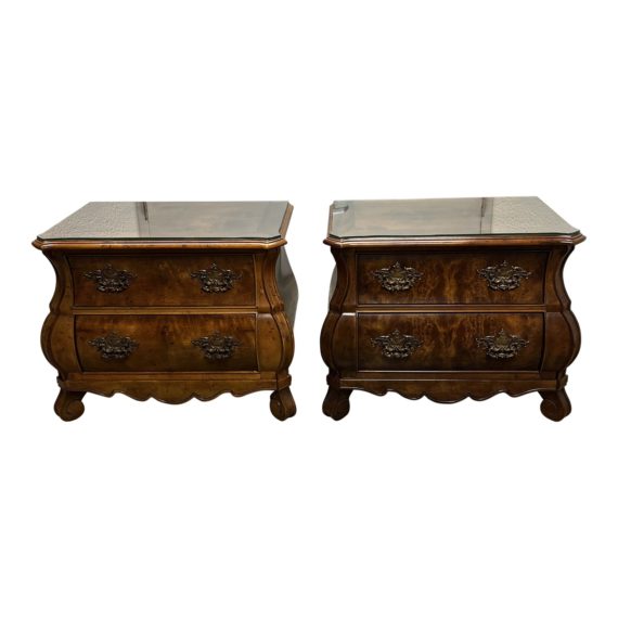 Design Plus Gallery presents a Pair of 1980’s French Bombe Style Villandry Collection Nightstands, made by Henredon. The nightstands are constructed with burl and walnut wood and feature ornate brass hardware. The drawers are made with dovetail joinery. The tops are rectangle-like, with diagonal square corners on the front. Custom glass tops are included. Minor wear from age and use; nightstands are in good condition. One nightstand appears to be a lighter finish, this is the type of woods that was used.