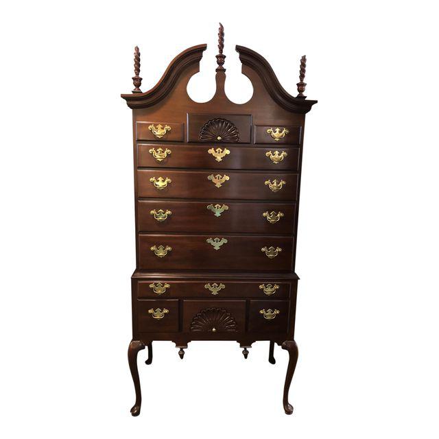 Design Plus Gallery presents a classic Queen Anne Highboy. This chest features a divided arch pediment with a central finial over a collection of tendrawers. Stylistic details include shell carved moldings, polished brass pulls, and cabriole legs.
