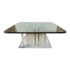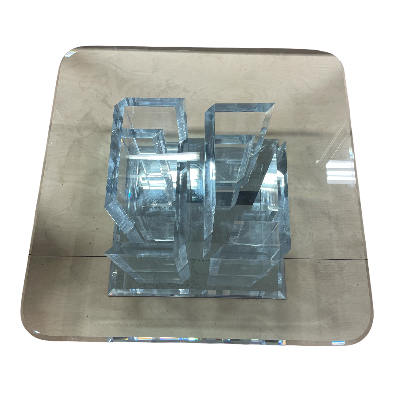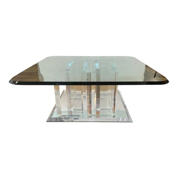 Design Plus Gallery presents a 1980’s Spectrum Acrylic Cocktail Table. Consist of a square mirrored + acrylic beveled base, four individual F-Shape acrylic prices that can be re-arranged to multiple designs. The surface is a thick polished rounded edge square glass. Visible and minor wear from usage.