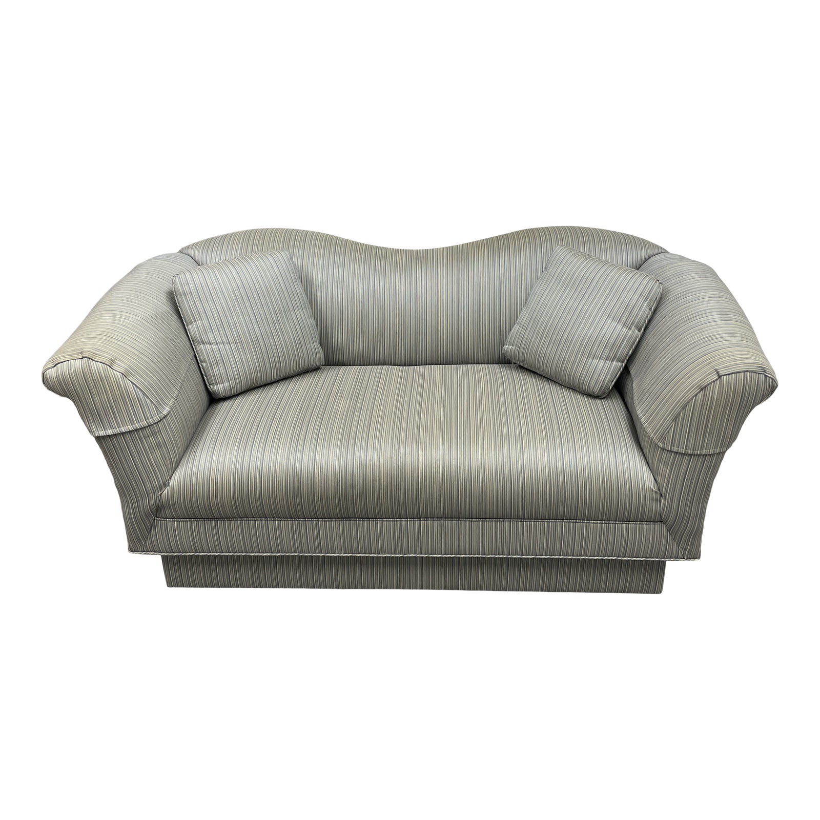 Design Plus Gallery presents a Vladimir Kagan for Directional Seafoam Green + Blue Striped Loveseat. Signature curved lines are encapsulated in this rare design in a small scale with a fully upholstered plinth base. Fabric is striped and comes with arm covers and pillows. Visible wear through out (pictured), loveseat is in good condition.