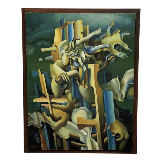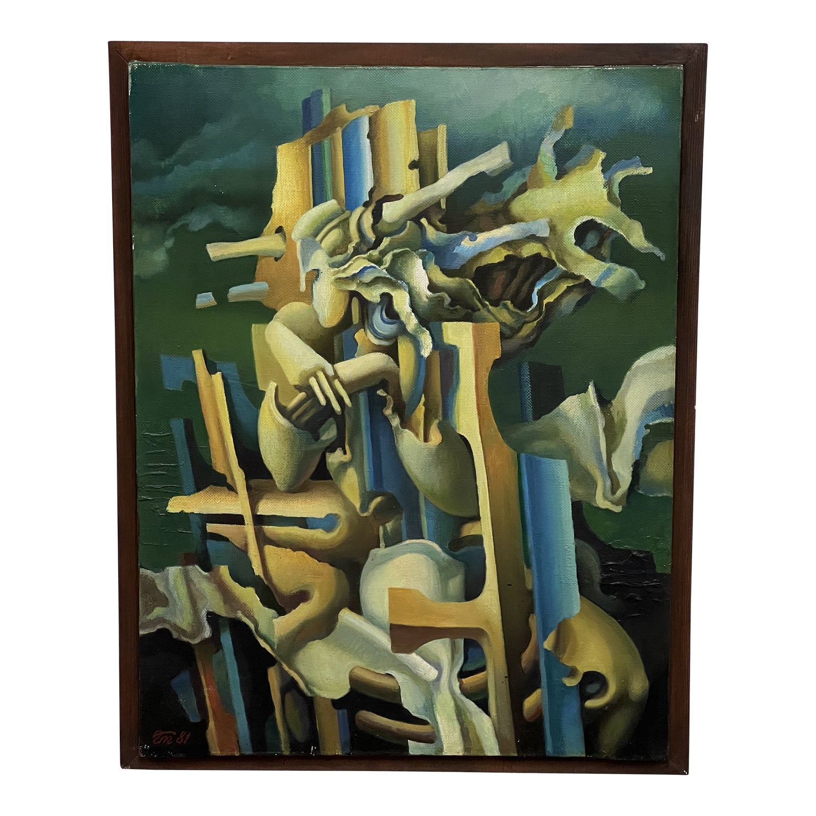 Design Plus Gallery presents an Artwork by Moscow Artist Gennady Troshkov, Titled Night Wind from 1981. Post modern work of art at the height of the Industrial Era. You can see the machine evolution in this piece with the colors through images of pipes and near human form. Vibrant, colorful yet cold as steel…Night Wind it is appropriately titled. In good condition, with artist signatures on back and dated as well.