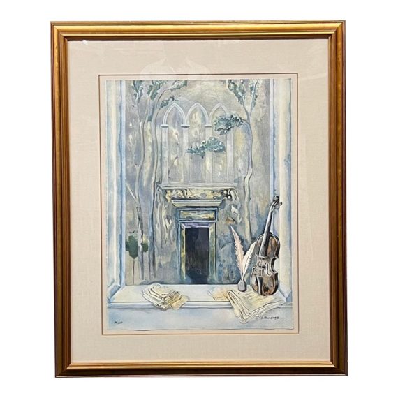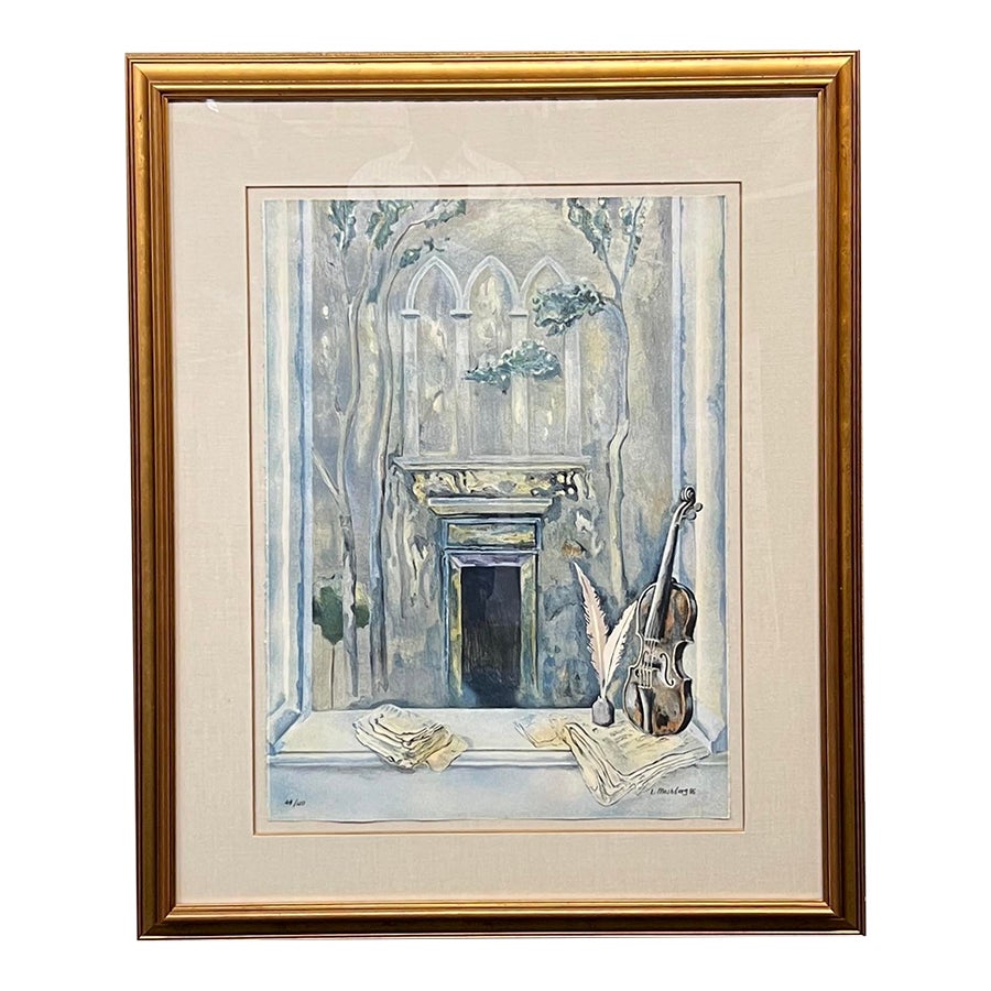 Design Plus Gallery presents a “Vivaldi’s Venice I”, an etched Lithograph by Lev Meshberg in 1986. A string instrument leans atop sheet music with a quill and ink. A building with an open doorway dominates the background. The year of creation and artist’s signature are on the bottom right corner. The art was single matted before being framed in wood with a gold finish. A hanging cord is attached on the back for mounting. Comes with certificate of authenticity. Minor wear from use; lithograph is in good condition.