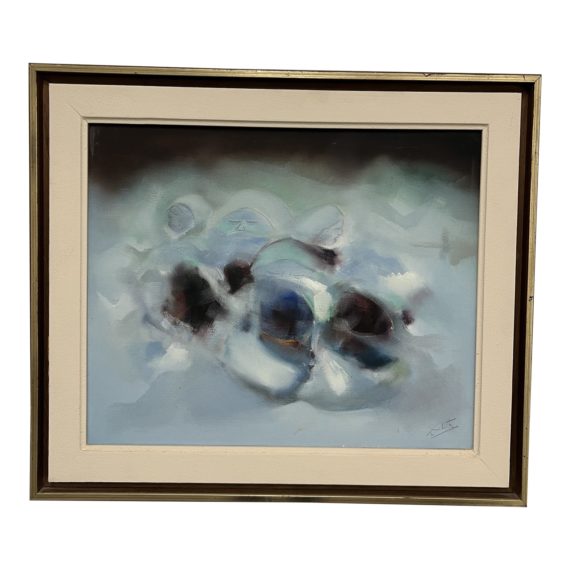 Design Plus Gallery presents a 1990’s Abstract Blue Signed + Framed Original Peruvian Artwork. This art depicts a mix of predominantly blue color combined abstractly and left for viewer’s interpretation. Some facial expressions are blended in near the top center. Artist signature is on the bottom right. The art is single-matted and framed in wood. A hanging cord’s attached in the back. Minor wear from age and use; art is in good condition. Originally purchased in Peru.