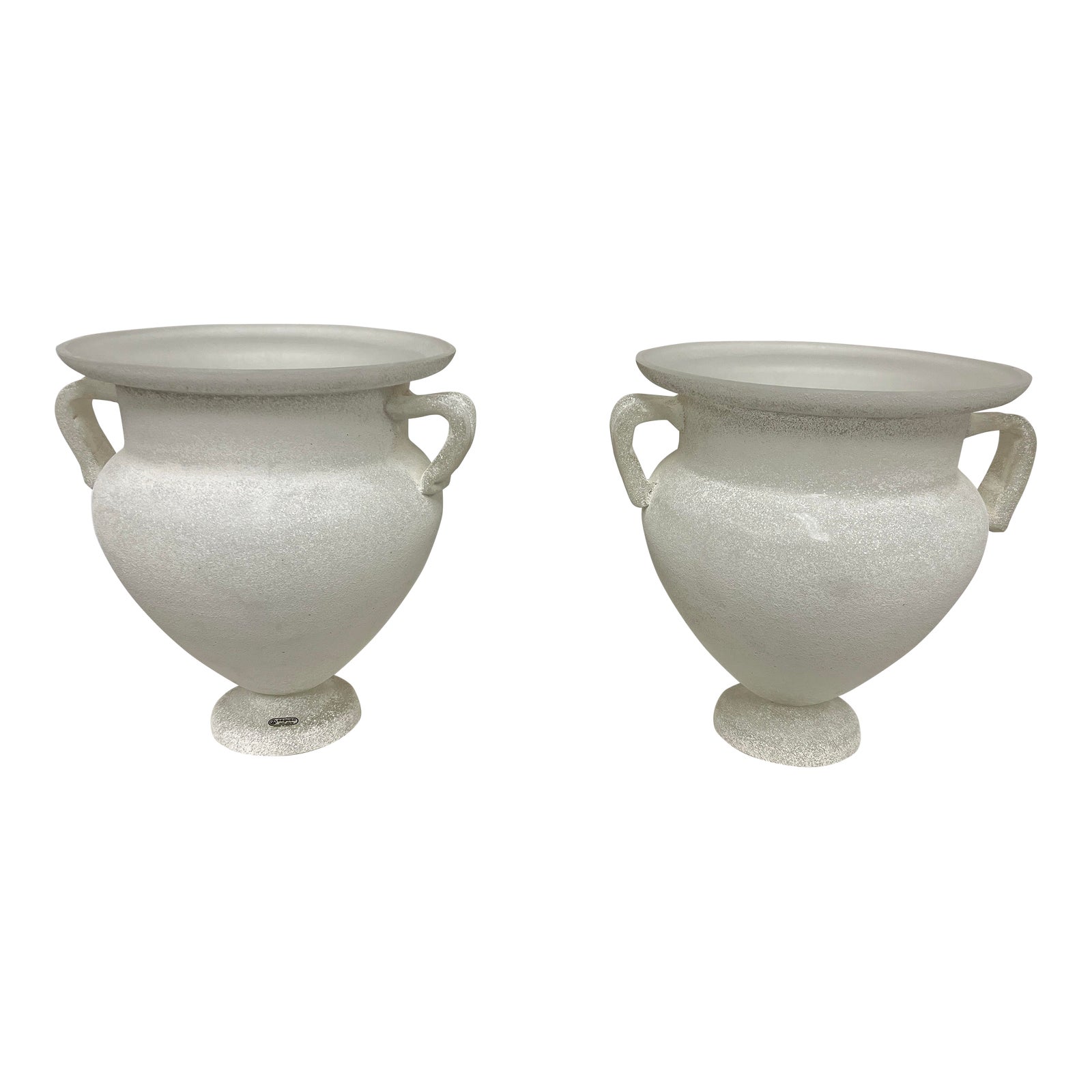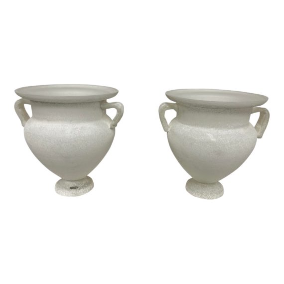 Design Plus Gallery presents a Pair of 1990’s Seguso Vetri d’Art Glass Urn Table Lamps. The large and Neo-classical forms are modernized with their refine silhouetted and frosted finish. Hand blown in Italy. There is minor where through out, pair is in good condition. Exterior is frosted with a glass speckle. Made in Italy.