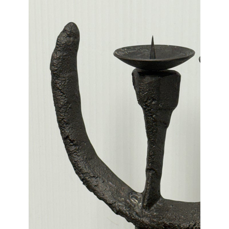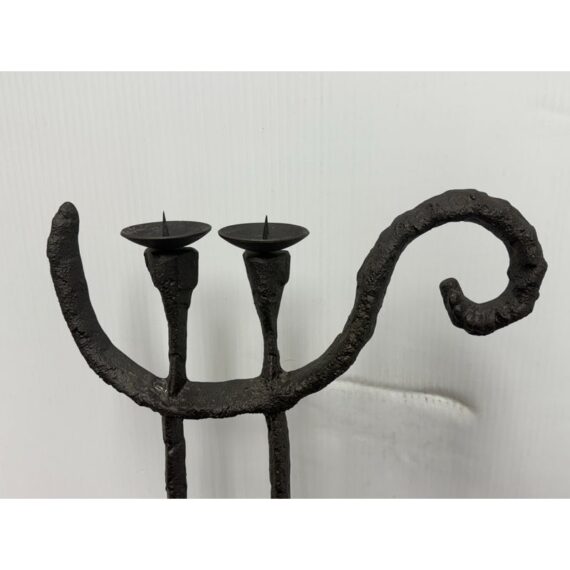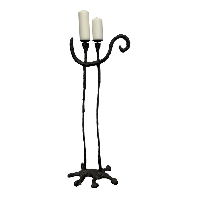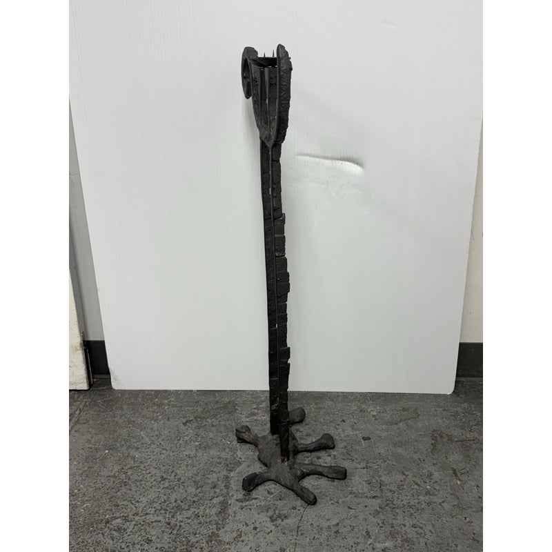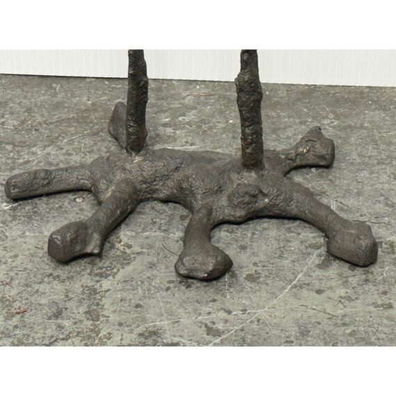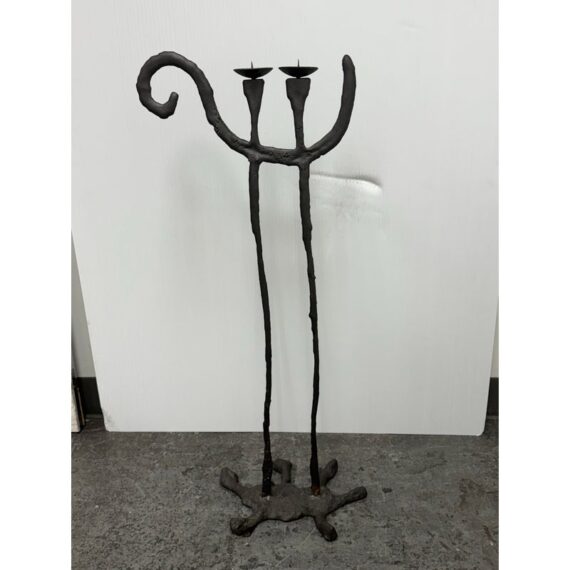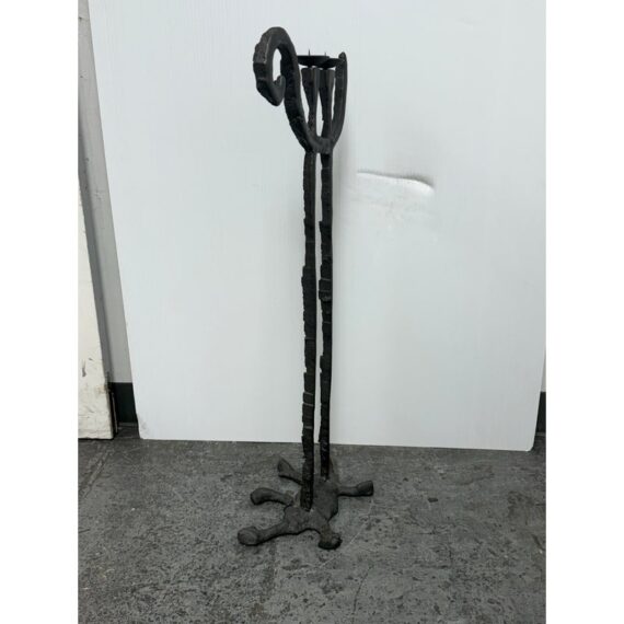 Design Plus Gallery presents a 1990’s Tony Mantos “Sunbathing Lizard” Standing Cast Iron Sculpture Floor Candle Holder. A striking blend of art and function, this floor-standing candelabrum channels a sun-drenched, desert sensibility through its material and form. The base is rendered with an organic, raw texture, while two slender forged rods rise from the base to the crown, sketching a graceful, lizard-like silhouette in space. The top culminates in a playful swirl finial, and two integrated candle holders provide practical illumination within the sculptural composition. The dark, weighty cast iron carries natural forge marks and a lived-in patina that underscore its brutalist/organic-modern character. In good condition, minimal wear from usage. Made in USA.