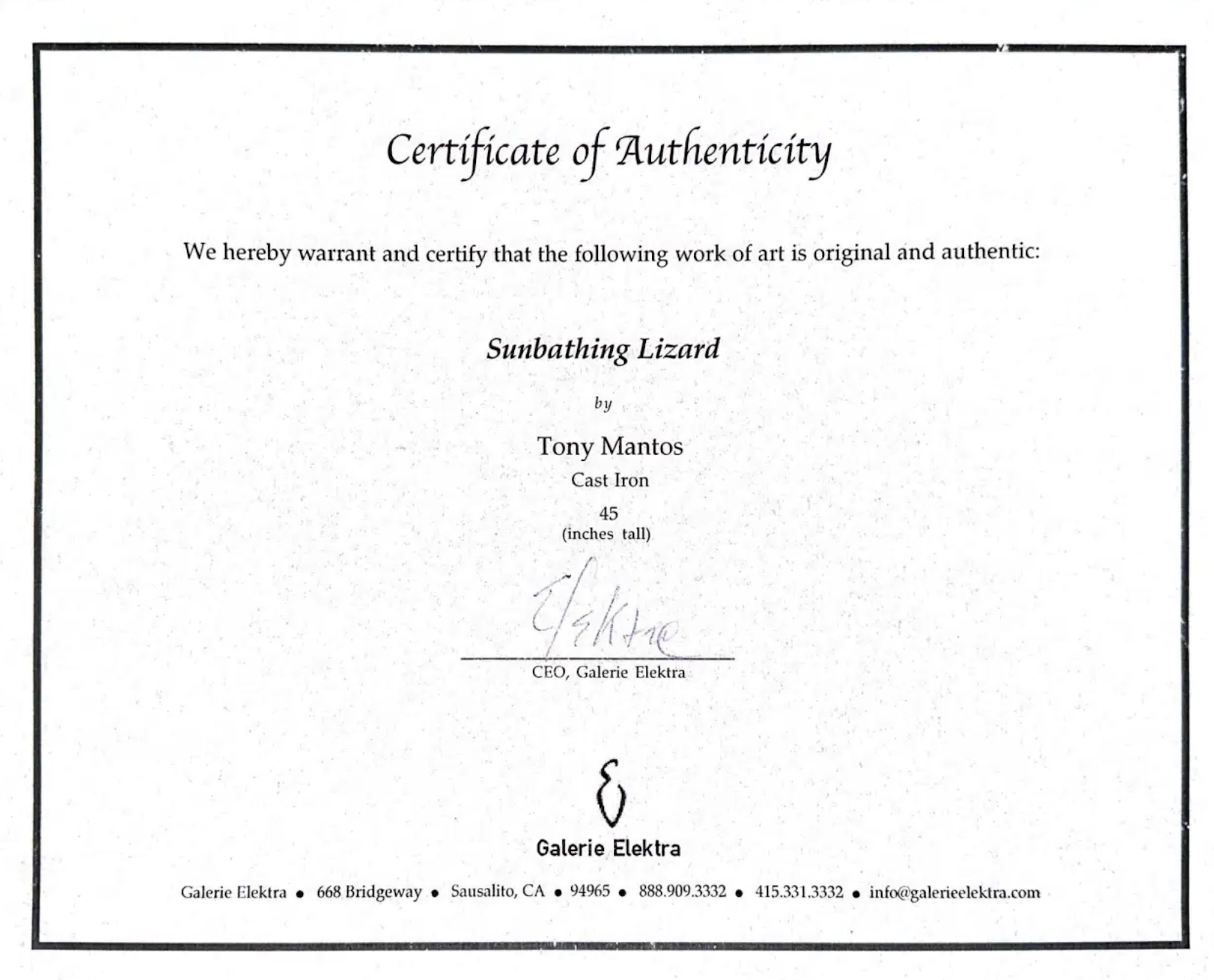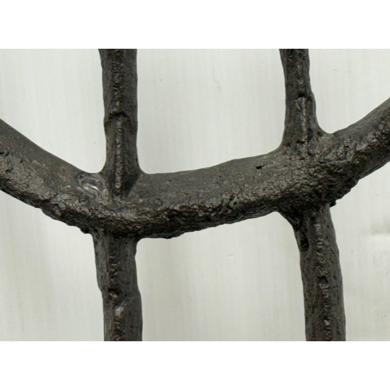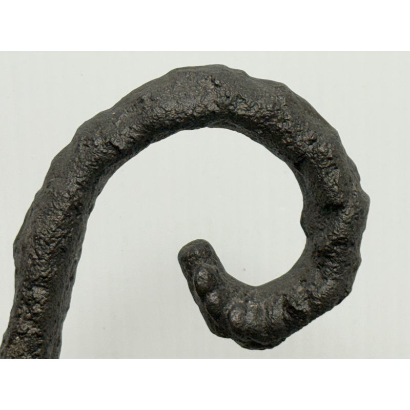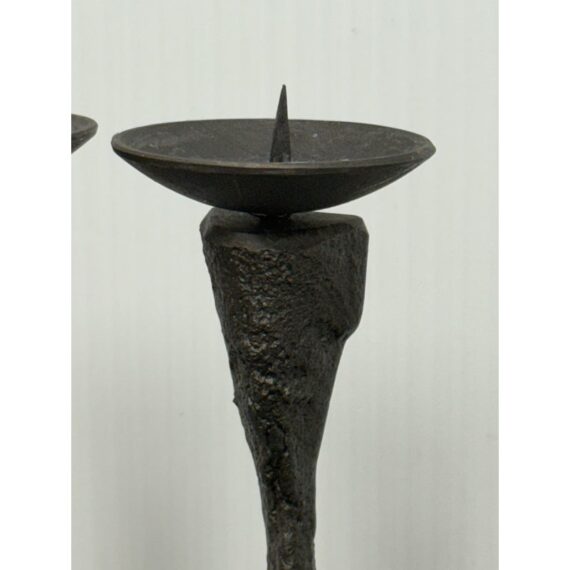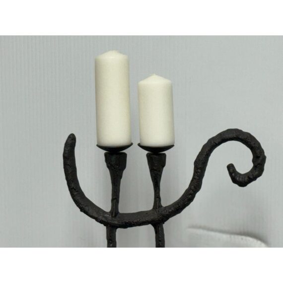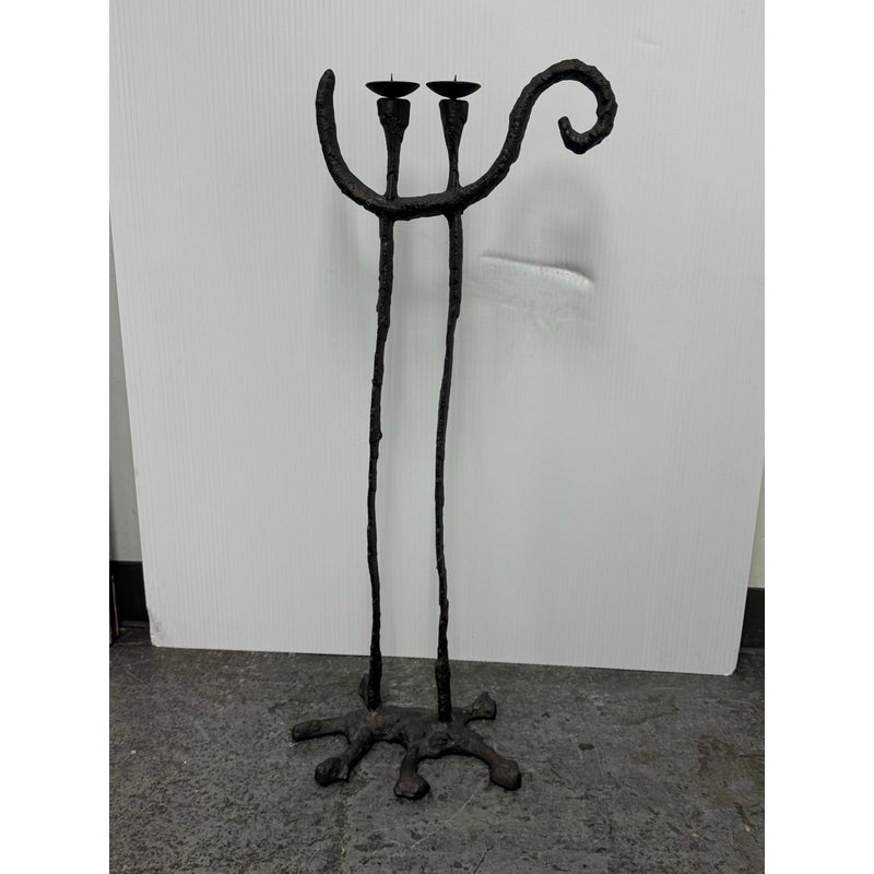Design Plus Gallery presents a 1990’s Tony Mantos “Sunbathing Lizard” Standing Cast Iron Sculpture Floor Candle Holder. A striking blend of art and function, this floor-standing candelabrum channels a sun-drenched, desert sensibility through its material and form. The base is rendered with an organic, raw texture, while two slender forged rods rise from the base to the crown, sketching a graceful, lizard-like silhouette in space. The top culminates in a playful swirl finial, and two integrated candle holders provide practical illumination within the sculptural composition. The dark, weighty cast iron carries natural forge marks and a lived-in patina that underscore its brutalist/organic-modern character. In good condition, minimal wear from usage. Made in USA.