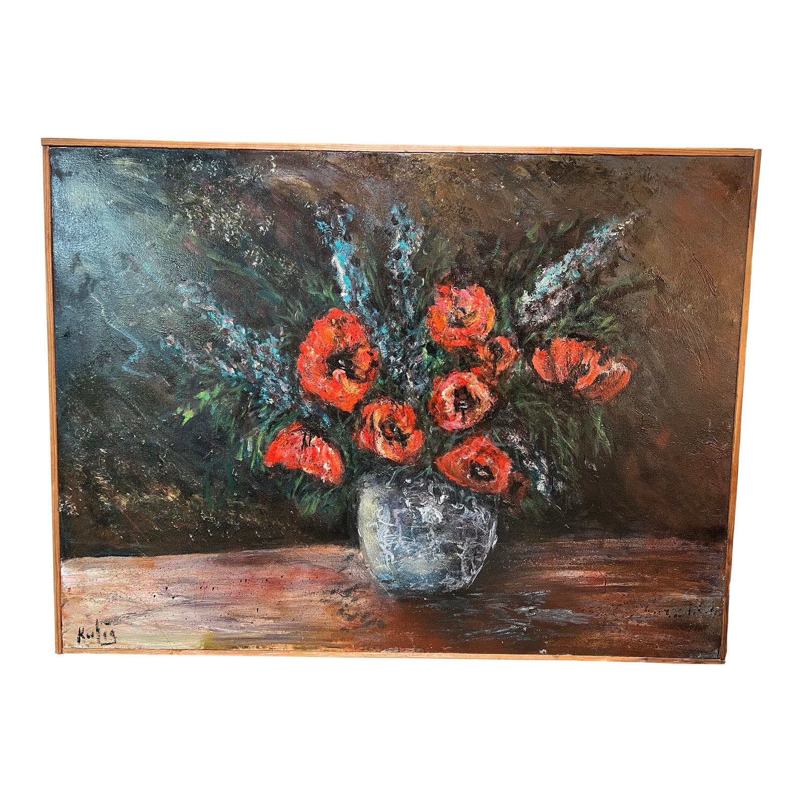 Design Plus Gallery presents “Flowers in a Crystal Vase“ an Original Oil Painting by Lawrence Kulig, circa 1993. The brilliant poppies in this large scale Painting or anything, but a still image. The color and brushstrokes explode in every direction. The image is fairly contained in a slim wood frame. Light surface wear evident, condition is consistent with age and use.