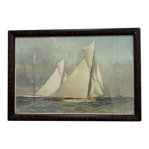 Design Plus Gallery presents a “Close Reach For The Stake Boat” Framed Art Print. Late 19th-Century rendering of a boat is reproduced in a mid century art print. Custom framed with a Chestnut stained wood frame. Visible wear.