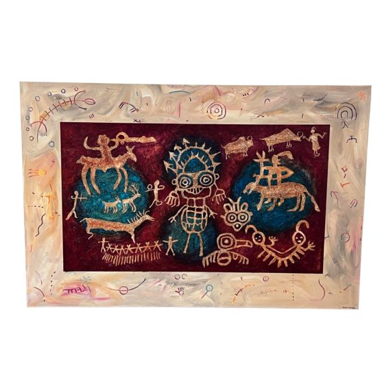 Design Plus Gallery presents Charles Huckeba’s Large Scale Artwork Titled ‘A Charles & Beth Project’, signed, titled + dated 1999. Chuck Huckeba is a contemporary painter who is known for his abstract artwork inspired by prehistoric rock art. He has a fine arts degree and graduate study from the University of California at Santa Barbara, where he studied under notable contemporary artists such as Larry Rivers and Irma Cavat. Huckeba’s influences include artists like Paul Klee, Jean Dubuffet, Adolf Gotlieb, Cy Twombly, Wassily Kandinski, and Joan Miro. Huckeba and his wife, Jill, have spent years exploring and documenting prehistoric pictographs and petroglyphs found in the Western United States Great Basin. In 1993, he began combining various painting techniques to interpret and present the rock art designs he had observed in a contemporary way. His paintings incorporate elements of the rock art into a contemporary presentation. Huckeba’s work can be found in corporate collections at The University of Northern Arizona, The University of California at Santa Barbara Art Museum, The CEU Prehistoric Museum, and The Museum of the San Rafael. His artwork is also displayed in several fine art galleries in Arizona. Private collectors, including actress Lily Tomlin and archaeologist and writer David S. Whitley, Ph.D., own his paintings. This artwork is in good condition with minimal wear.