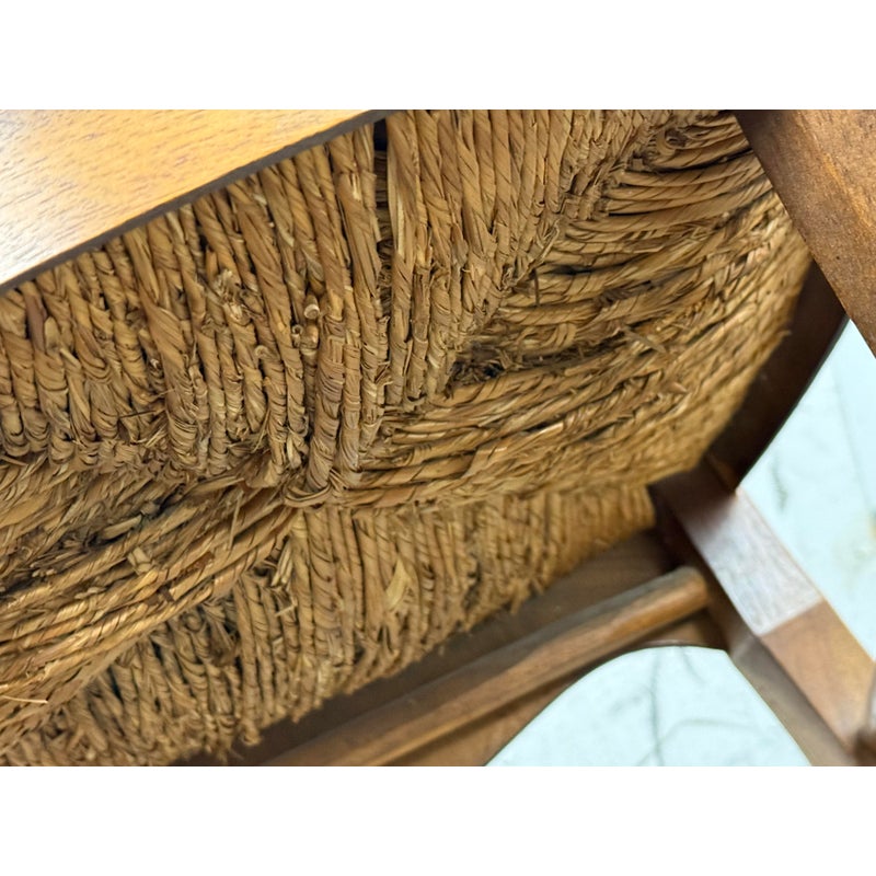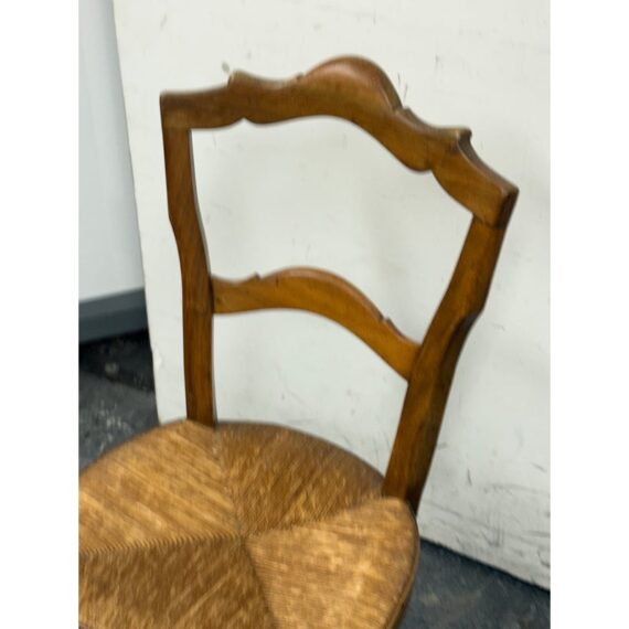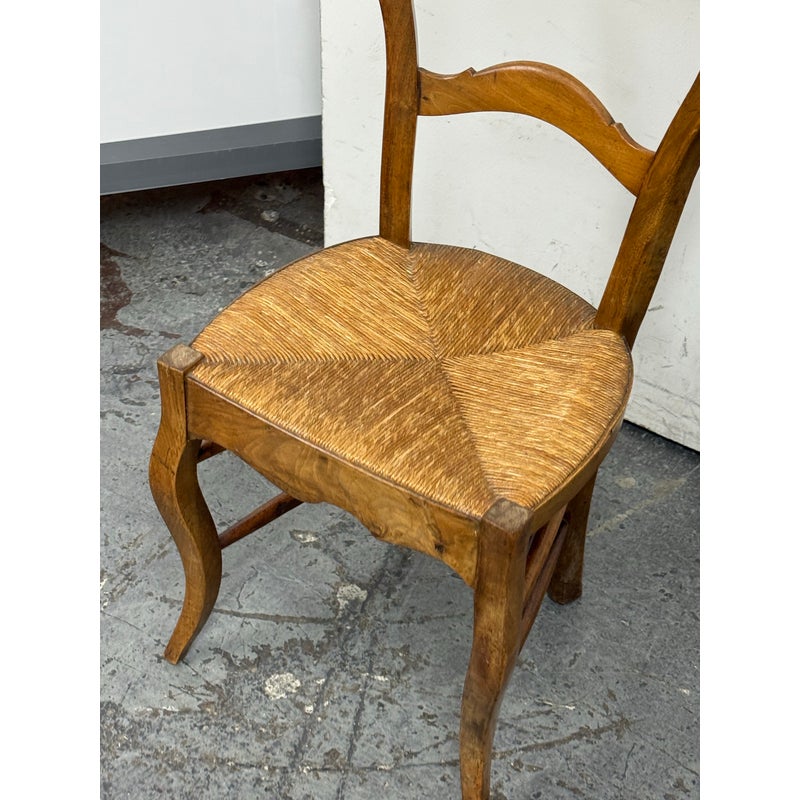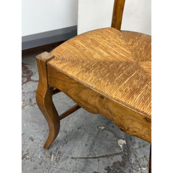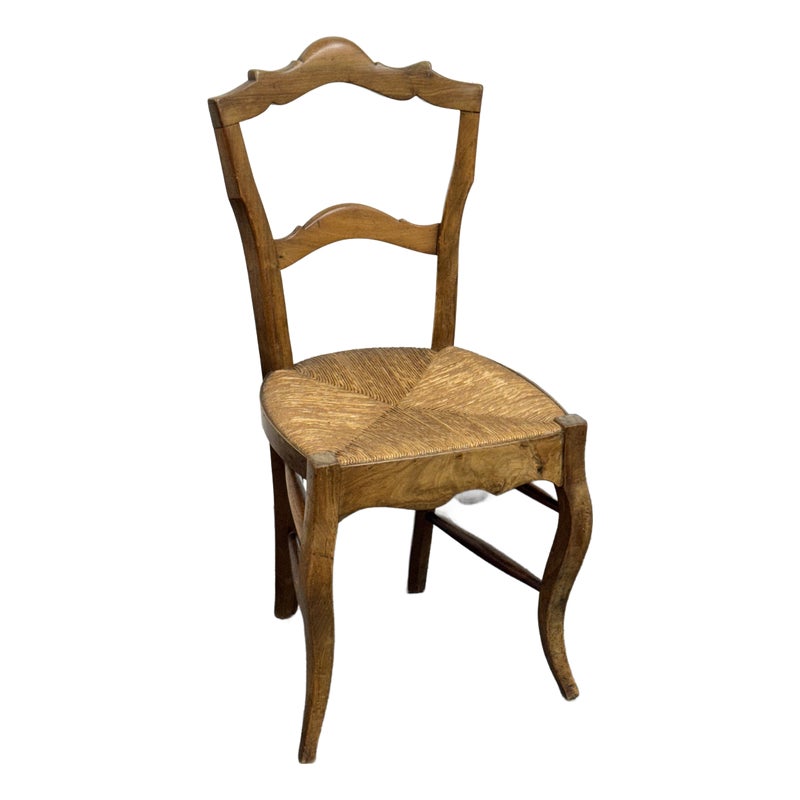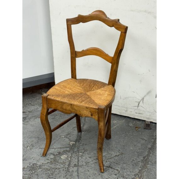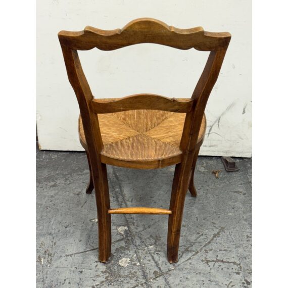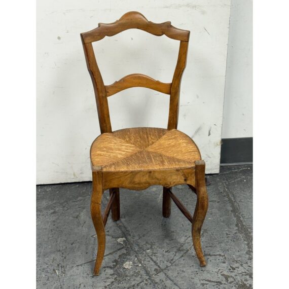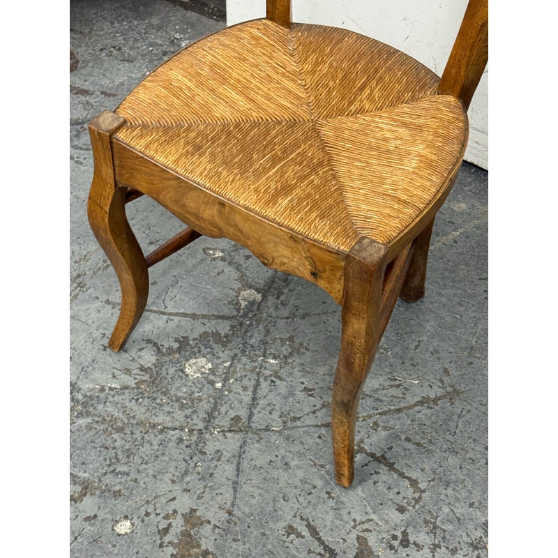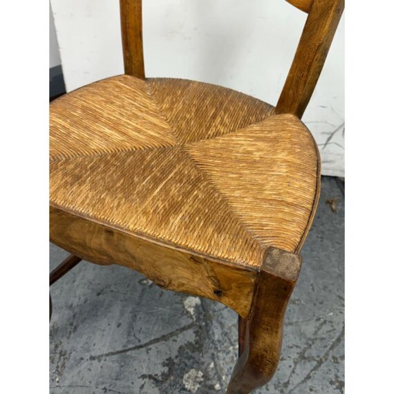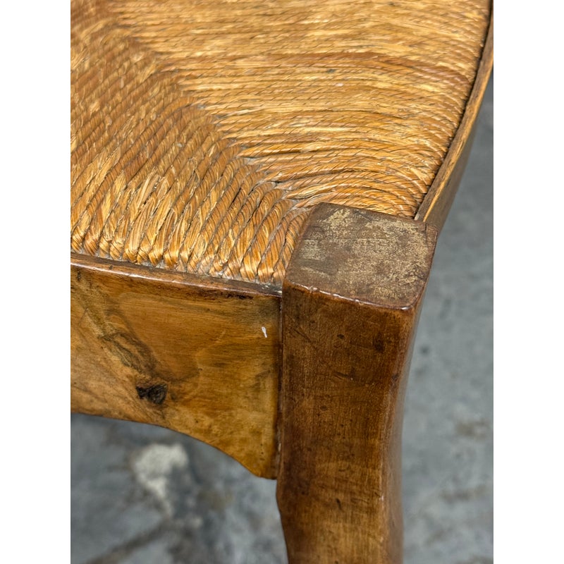 Design Plus Gallery presents a Fruitwood + Rush Side Chair of the English 19th Century. The chair was likely hand crafted in England circa 1870 and is just darling with its carved scalloped seat back with a warm rush seat. Straight stretchers run across the two sides and back for support. The honey brown color + rich patina make this a great chair for most homes with history. Is in good condition for its antique age with minimal surface wear that is consistent with use.