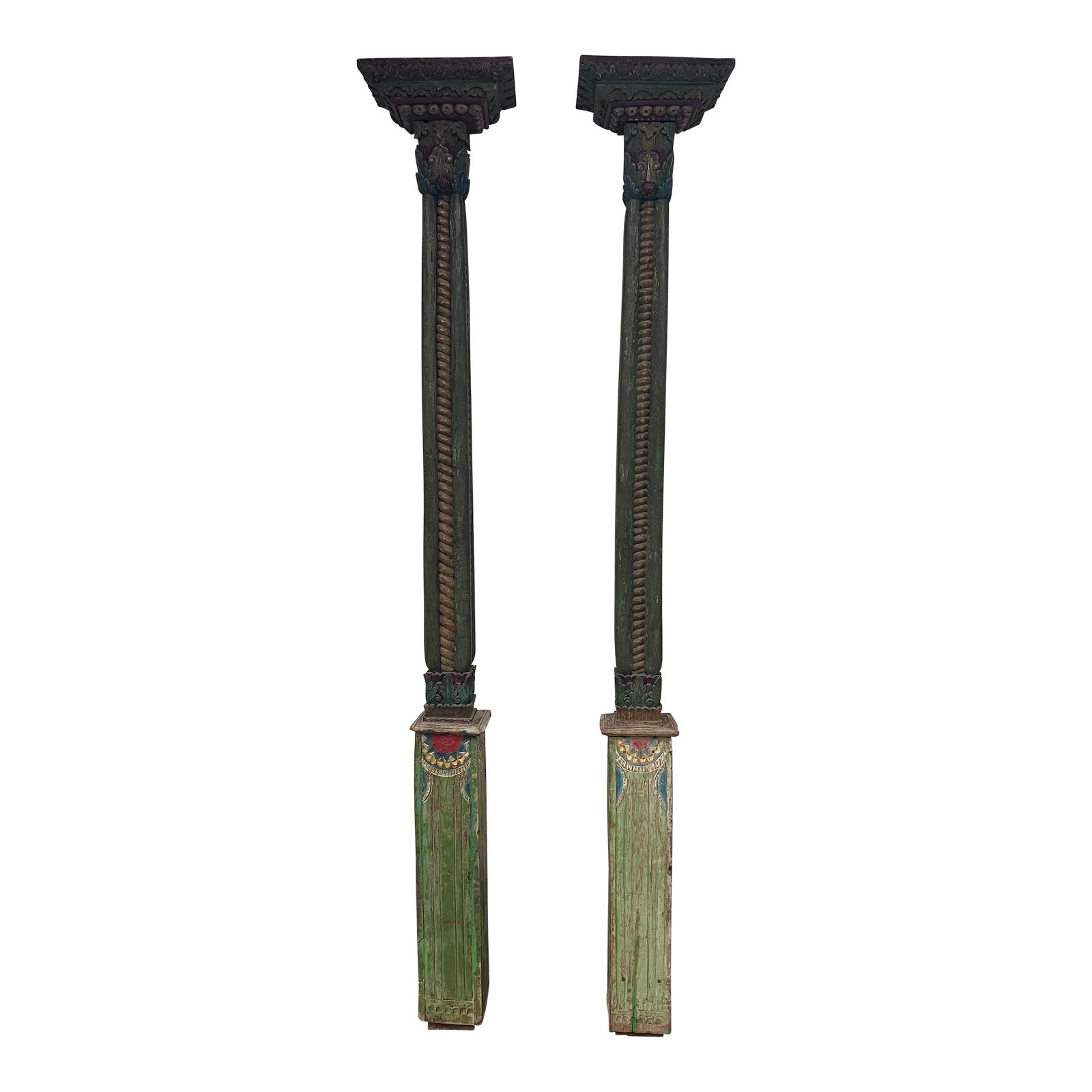 Design Plus Gallery presents a Pair of Hand Carved 19th Century Pillars from Bali. A stunning antique piece that dates back to the 19th century. The pillars feature a square top design, adding a unique and interesting element to their overall aesthetic. The natural hand painted and carved details showcase patterns and designs, with a beautiful overall green finish that adds a touch of vibrancy to the piece. The heavily distressed patina adds to the vintage charm and character of the pillars, making them a true one-of-a-kind find. These pillars are not only a testament to the rich cultural history of Bali, but they also serve as a decorative piece that can effortlessly elevate the style of any space. Whether placed in a living room, dining room, or entryway, these wood carved pillars are sure to make a statement and become a focal point in any room. Visible wear from usage + age. Does not come with bases for the pillars.