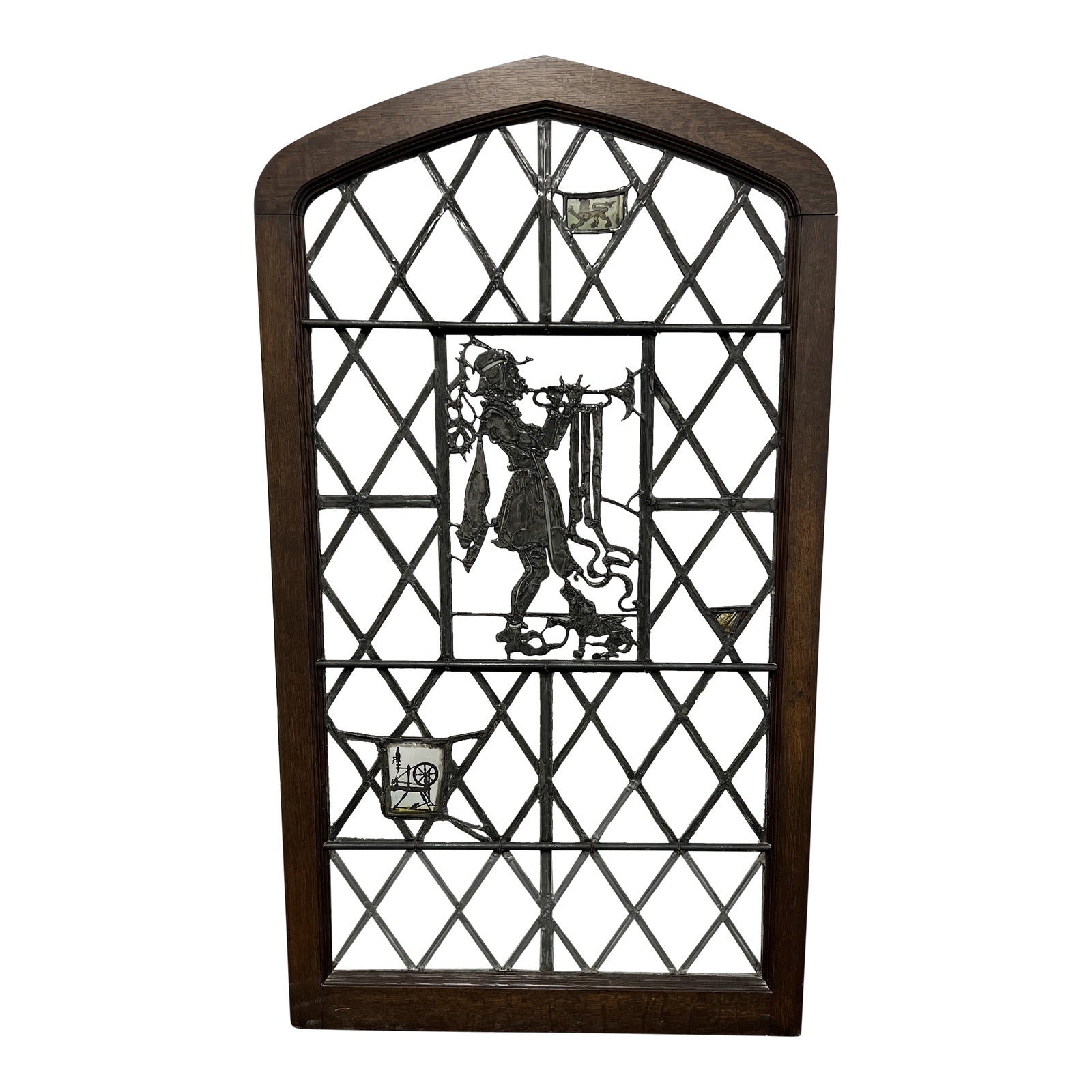 Design Plus Gallery presents a 19th Century Bugler Leaded Glass Window Pane. A silhouette of a musician playing a trumpet anchors the center with a dog at the figure’s feet. The leaded panes are diamond patterned with a lion’s stained glass and loom embedded within the grid. The wood frame incapsulates the original glass beautifully. There is minor wear through out, window is in good condition.
