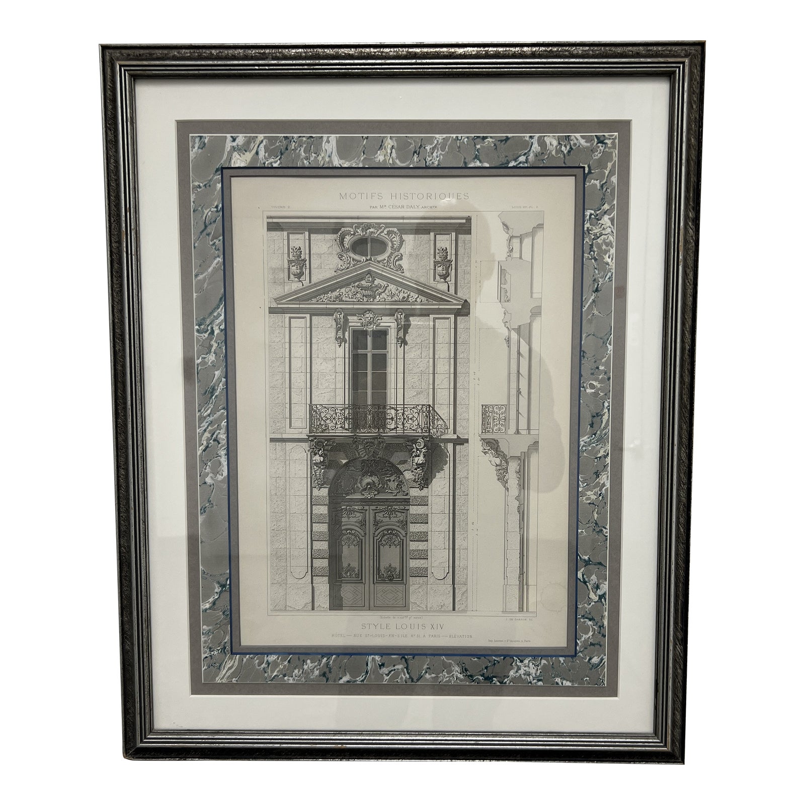 Design Plus Gallery presents a 19th Century Cesar Daly French Architecture Engraving Hotel on St. Louis Street – Matted . This motif Historiques is of Hotel of Rue de St. Louis, or Hotel on St. Louis Street is what is captured in this print. The architecture is of the Louis 14th and has been professionally framed with a blue + gray marbled matting that is unusual and striking addition to this timeless print. The frame is in a distressed silver that also highlights this neoclassical print. In fair condition, with some water spotting on the lower right side.