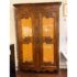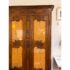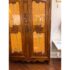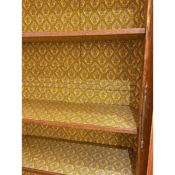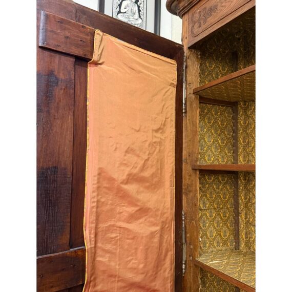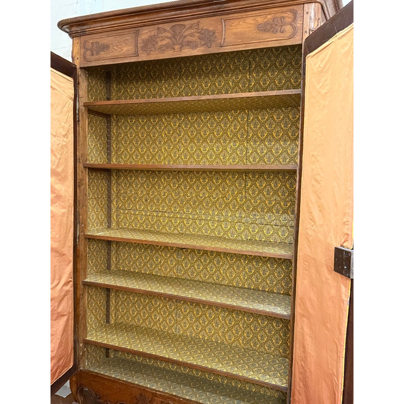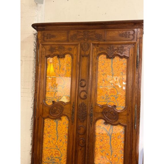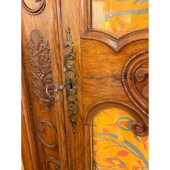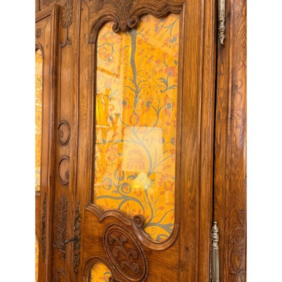 Design Plus Gallery presents a 19th Century French Provincial Louis XV Armoire. Constructed from solid woods with a substantial presence, this armoire showcases two paneled doors fitted with glass inserts backed by upholstered fabric that reveals an ornate floral textile. The façade is adorned with detailed carvings, flowing contours, and original metal hardware that reflect period styling and skilled workmanship. Inside, the interior is fully lined and upholstered, offering adjustable shelves that maintain the original decorative pattern throughout. The overall composition highlights careful attention to proportion, ornamentation, and material integrity consistent with 19th century French Provincial design. It is in good condition with visible and minimal wear from usage.