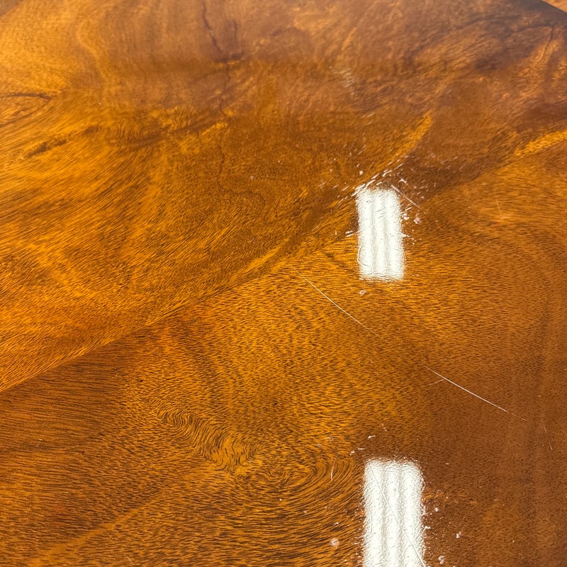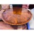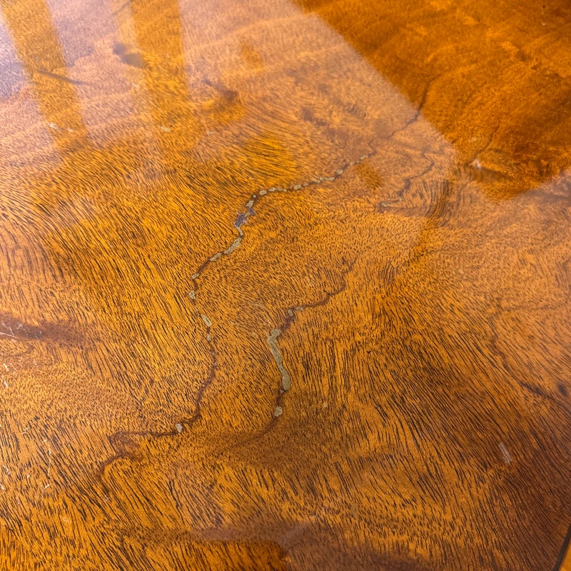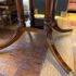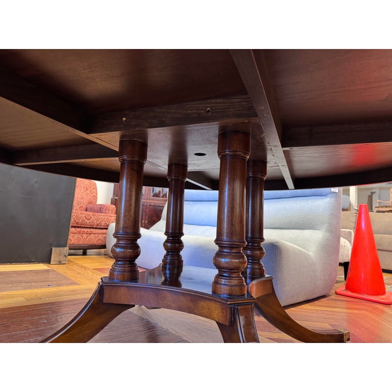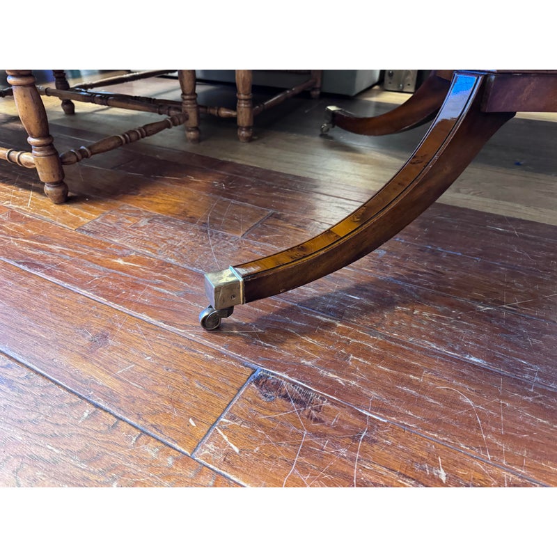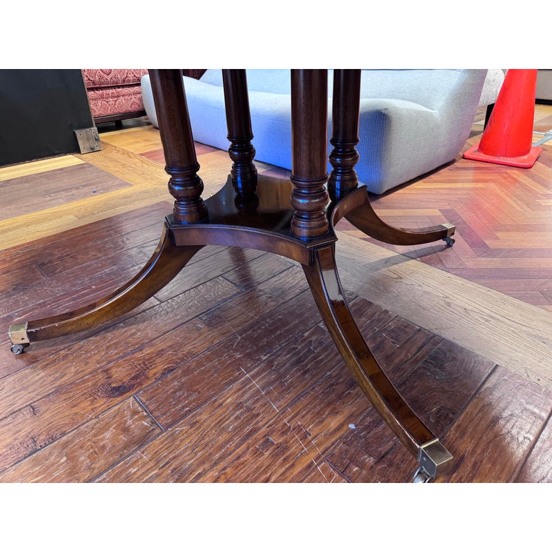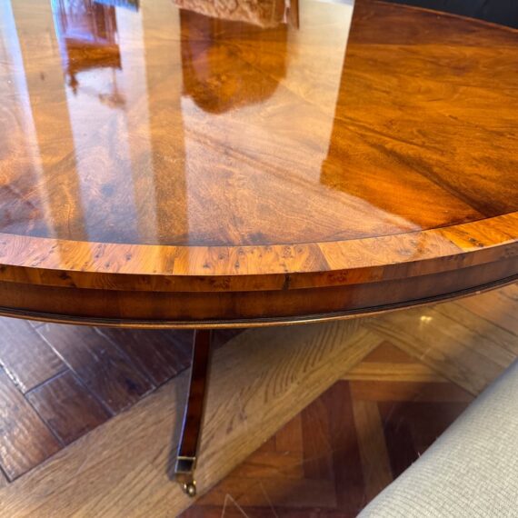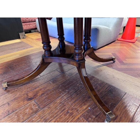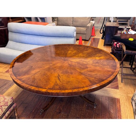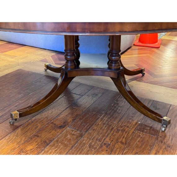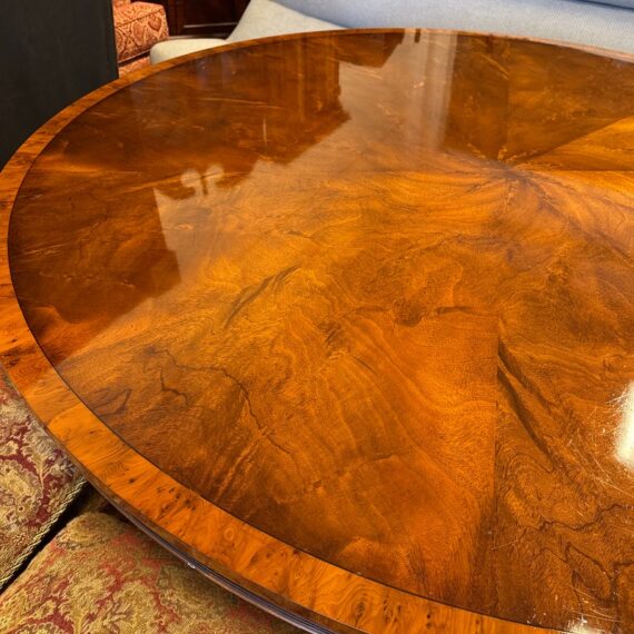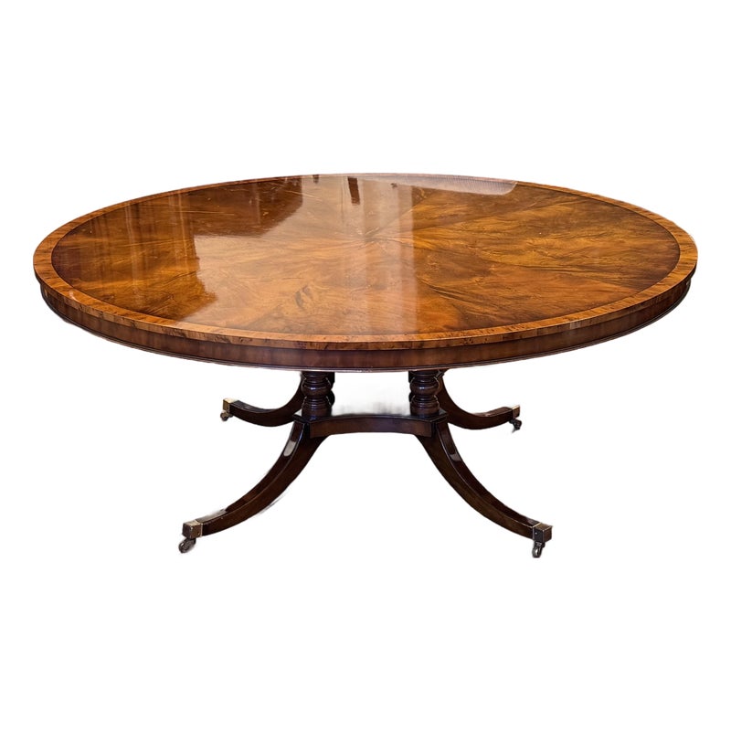 Design Plus Gallery presents a 19th Century Reproduction Round Dining Table. Regency-inspired elegance meets everyday function in this round dining table, crowned with a radiant starburst of flame mahogany veneer. A pedestal of four turned wood pillars rises from a quadruped base of gracefully curved legs, each terminating in classic brass casters—a refined nod to English Regency design. In good condition, visible surface wear from usage. Table is slightly tilted. Made in the United Kingdom.