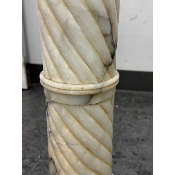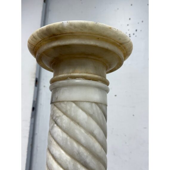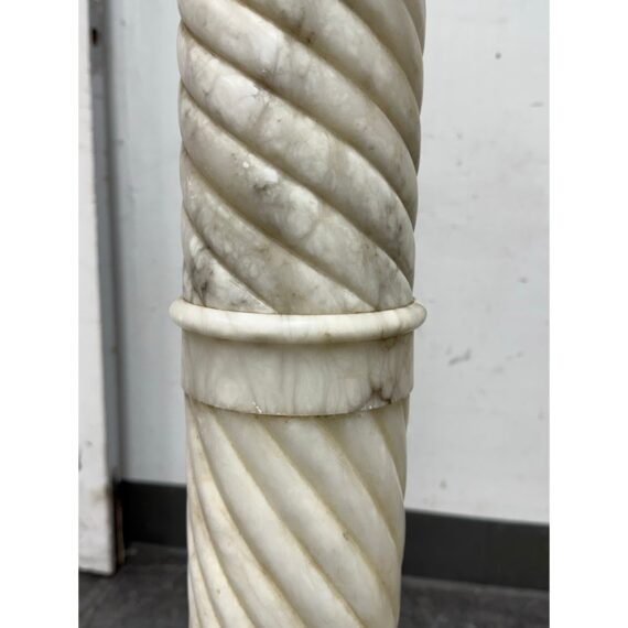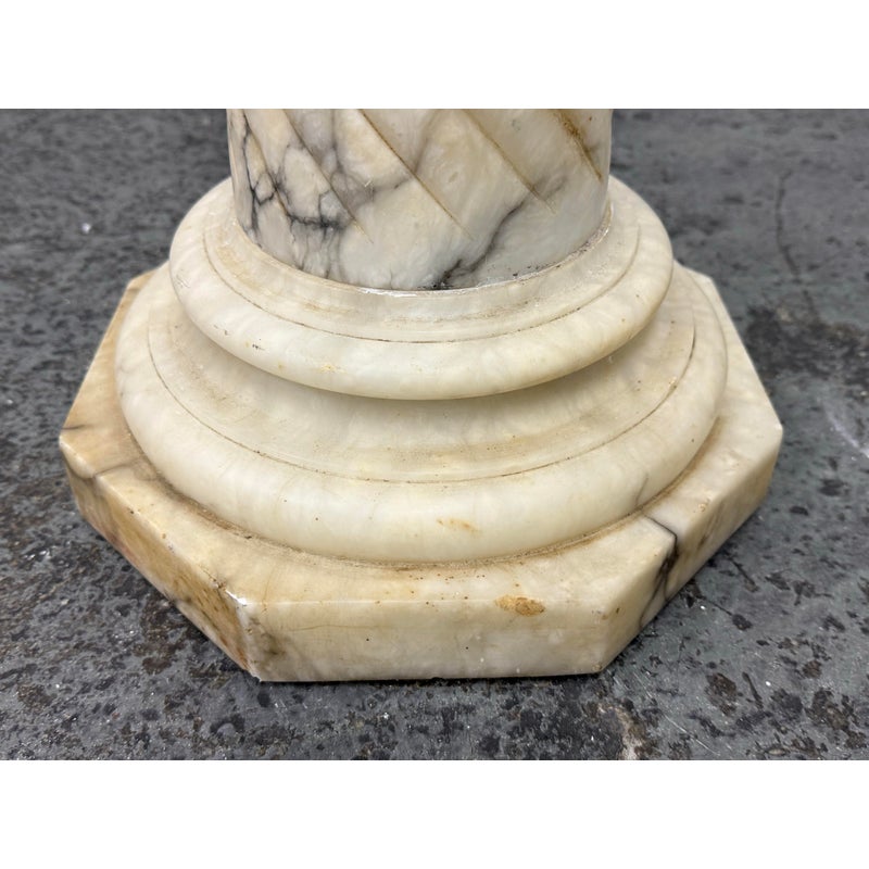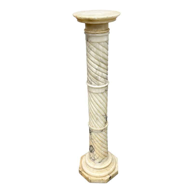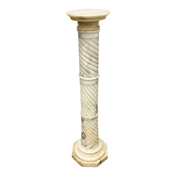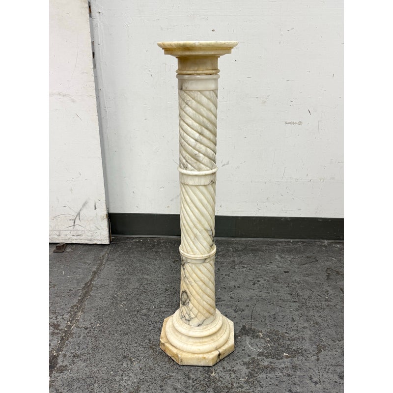 Design Plus Gallery presents a Marble Pedestal from the 19th Century. The pedestal has a spiral carved central column and stack layers at the base and pedestal. The cream tone shows the marble veining of black and gray for you to proudly display. It separates into sections for easy movement. The column has visible surface wear with slight staining to the top platform but overall we consider it to be in good condition for its antique age.