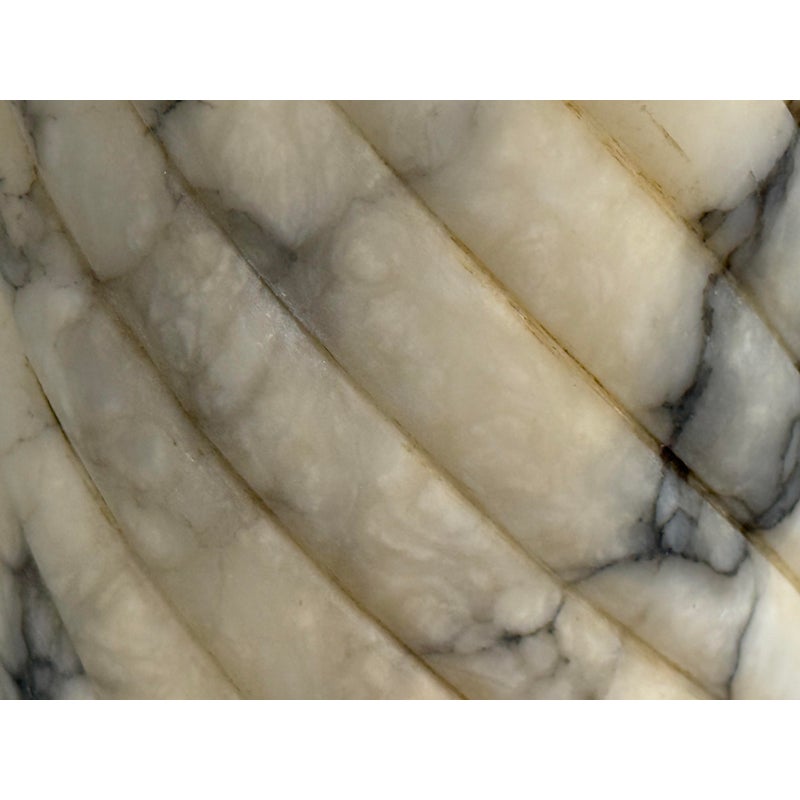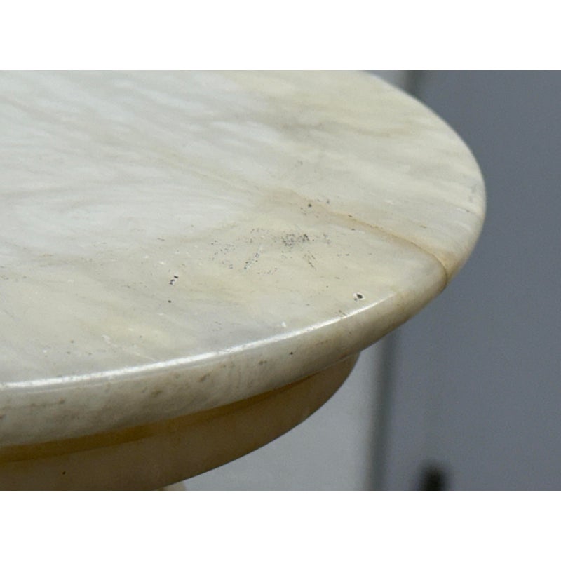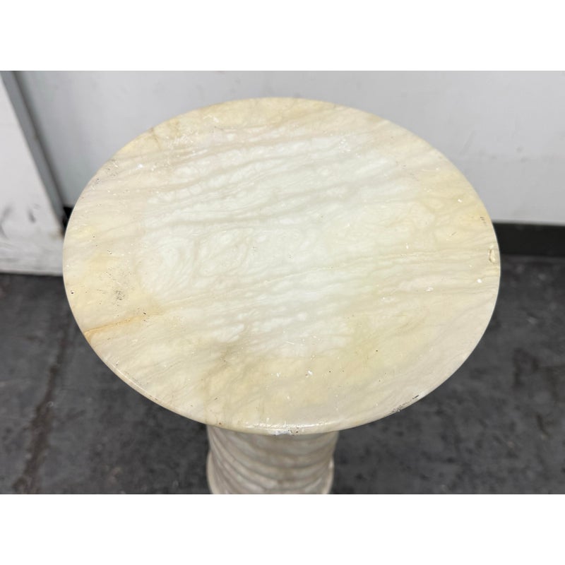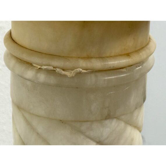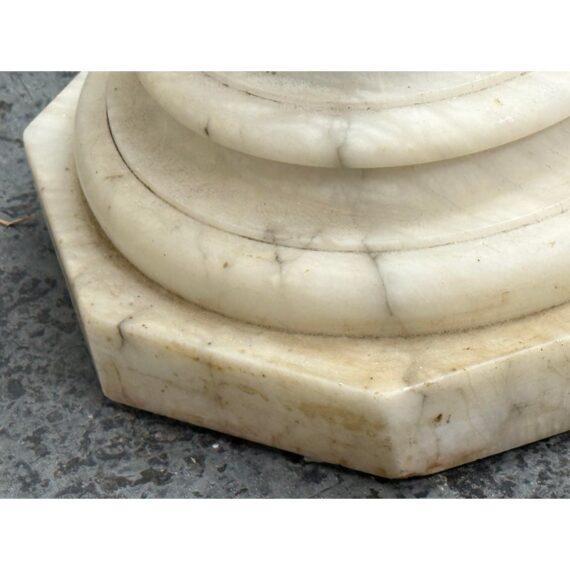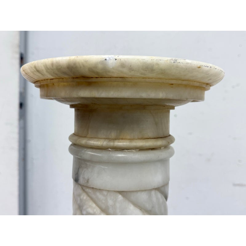 Design Plus Gallery presents a Marble Pedestal from the 19th Century. The pedestal has a spiral carved central column and stack layers at the base and pedestal. The cream tone shows the marble veining of black and gray for you to proudly display. It separates into sections for easy movement. The column has visible surface wear with slight staining to the top platform but overall we consider it to be in good condition for its antique age.