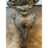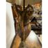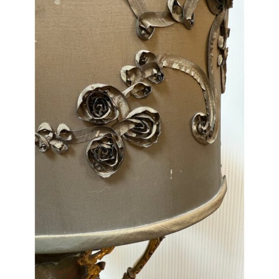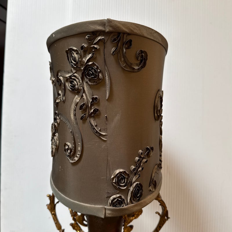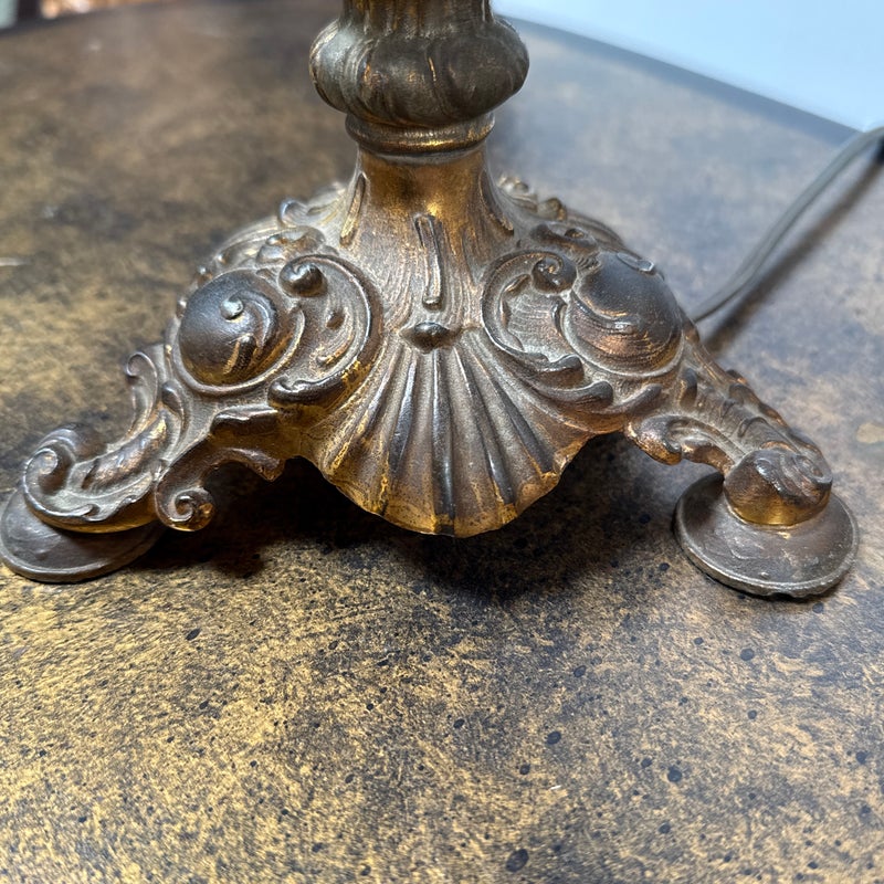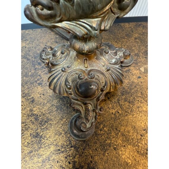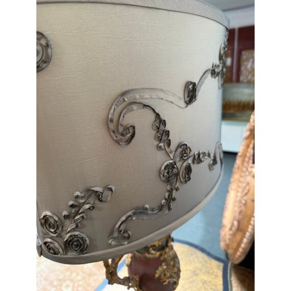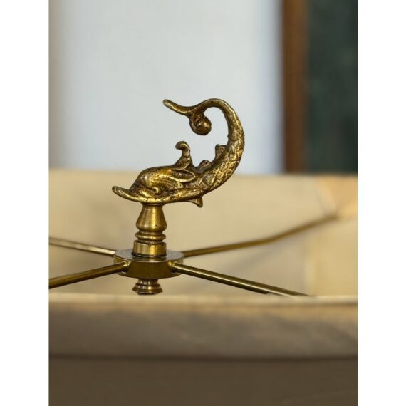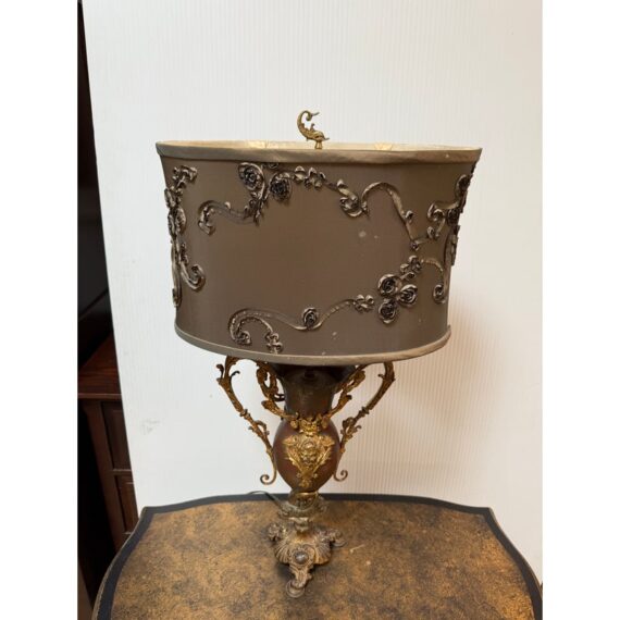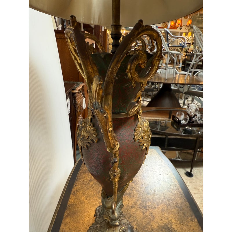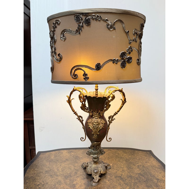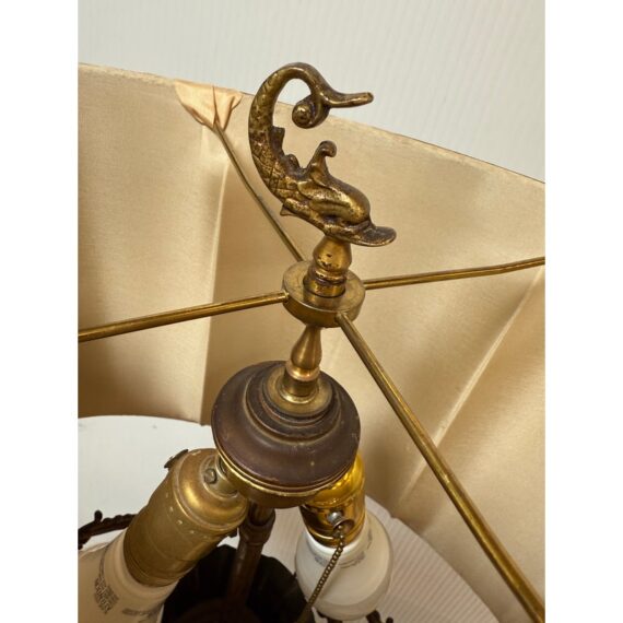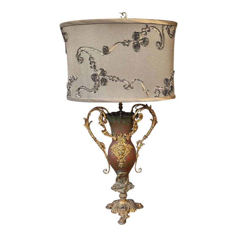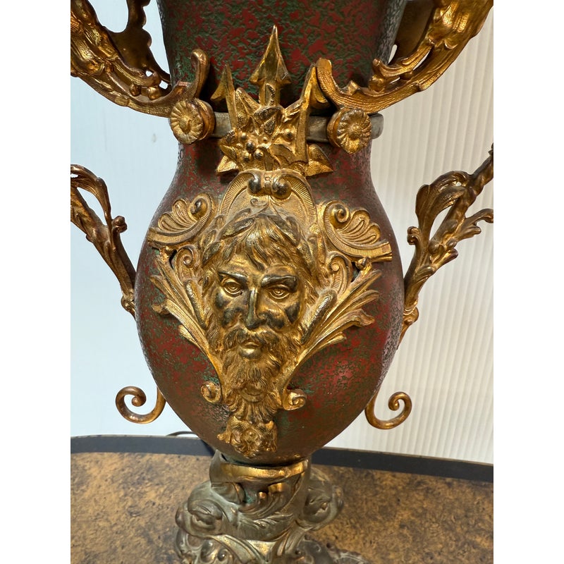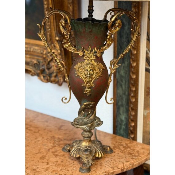 Design Plus Gallery presents a 19th Century Neptune Table Lamp. A stunning example of ornate Gothic revival design, featuring a magnificent form of Poseidon (Neptune), the ancient God of the Sea. The top finial is of a dolphin or koi fish. The lamp’s base and body are adorned with lavish brass decorations, including scrolling motifs and elaborate flourishes that evoke the grandeur of the Victorian era. Both sides of the lamp are richly decorated, ensuring it is a captivating centerpiece from any angle. The central column of the lamp is fashioned from a deeply distressed red metal, providing a striking contrast to the gold-toned brass accents. The blend of red and gold, along with the mythological and aquatic motifs, creates a sense of opulence and drama. This lamp is a functional lighting piece and also a work of art, perfect for collectors and admirers of Victorian Gothic décor. Accompanied by an oval shade with accented texture. No brand signature. In good condition, visible and minimal wear from usage.