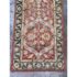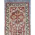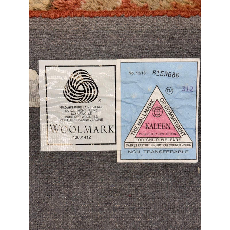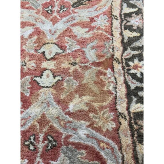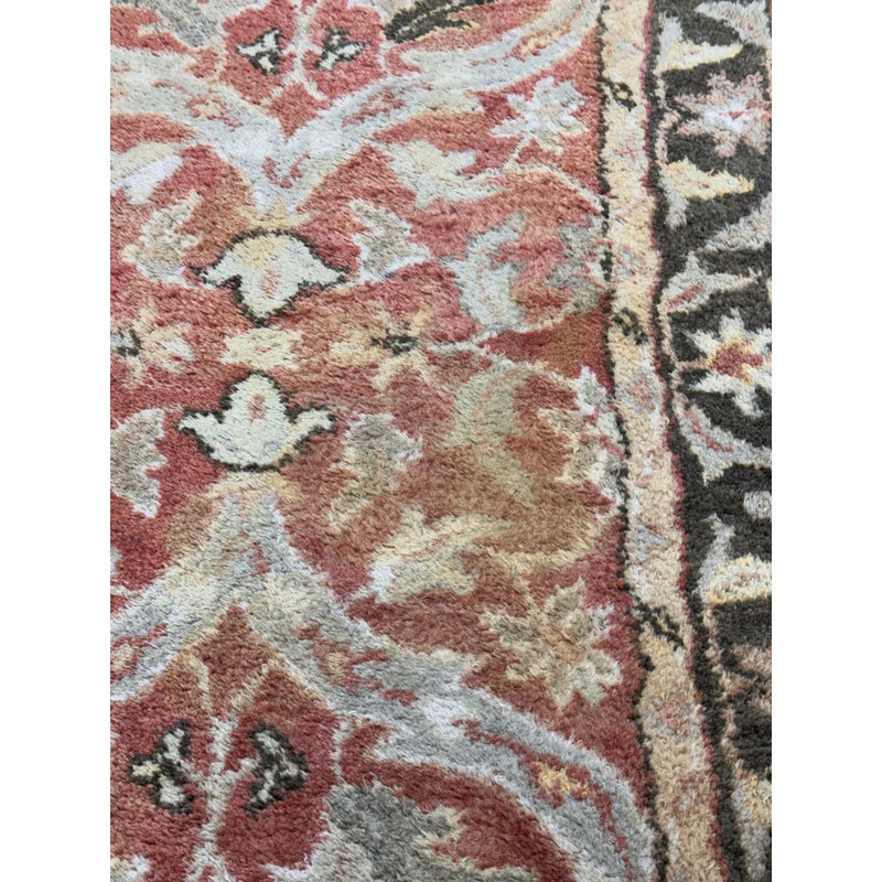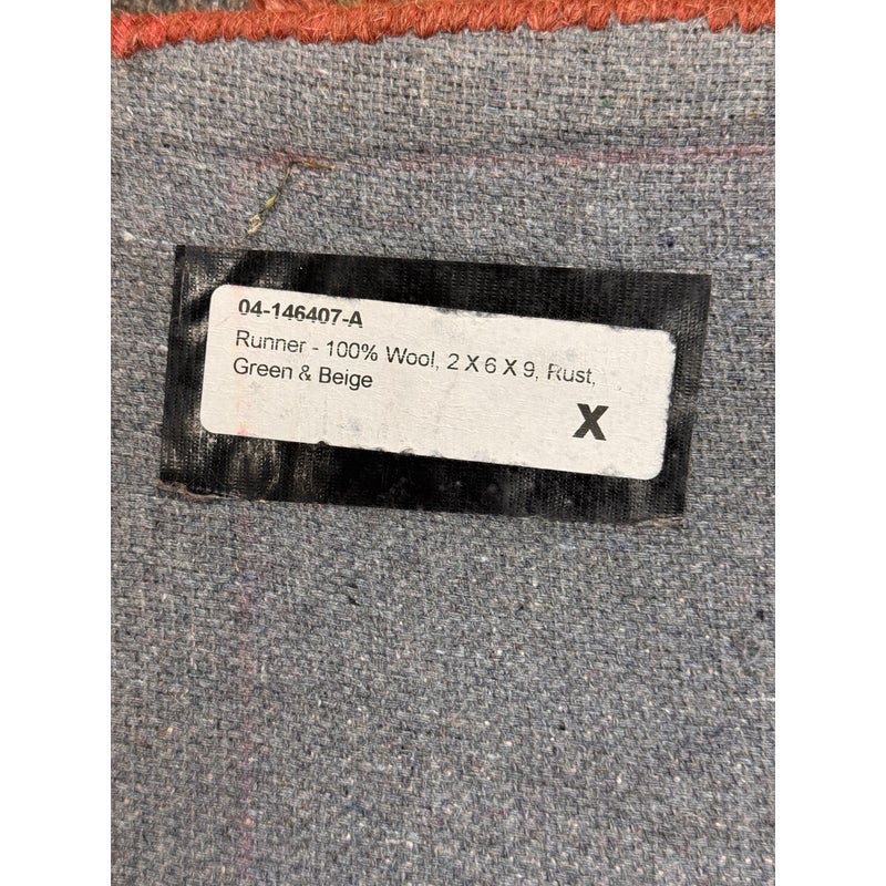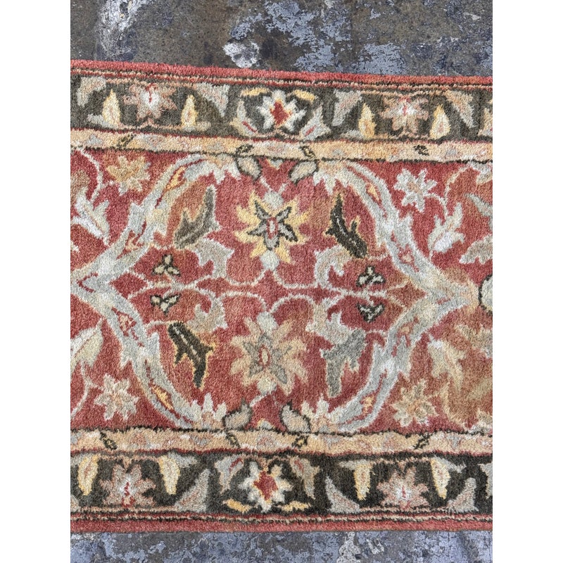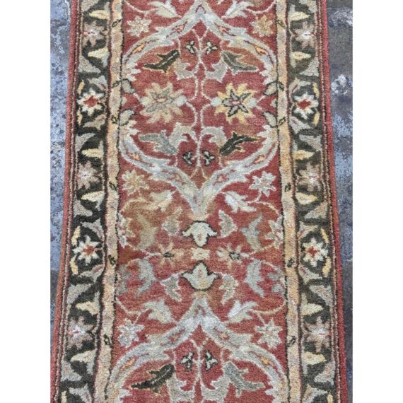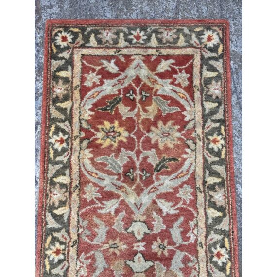 Design Plus Gallery presents a 2ft 6in x 9ft 1in Traditional Floral Wool Runner Rug. It has a terracotta-red field framed by an olive and tan border. Scrolling vine work and stylized blossoms repeat along the length, with accents in cream, gold, and muted green for added contrast. The pile has a soft, tufted feel, and the edges are neatly bound for a tailored outline and lasting structure. It is in good condition with visible and minimal wear from usage.