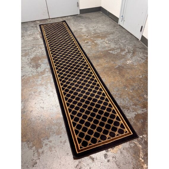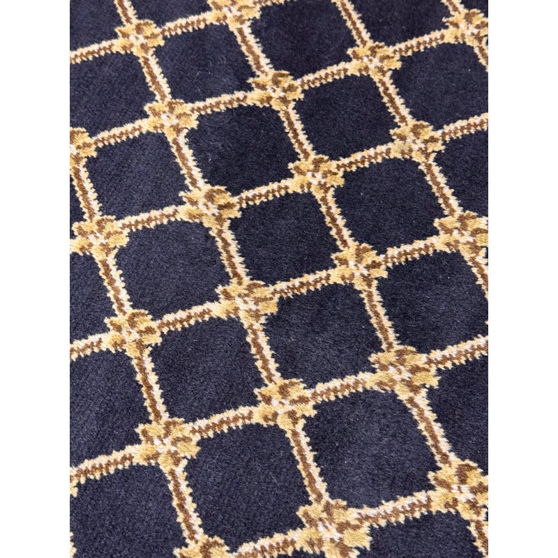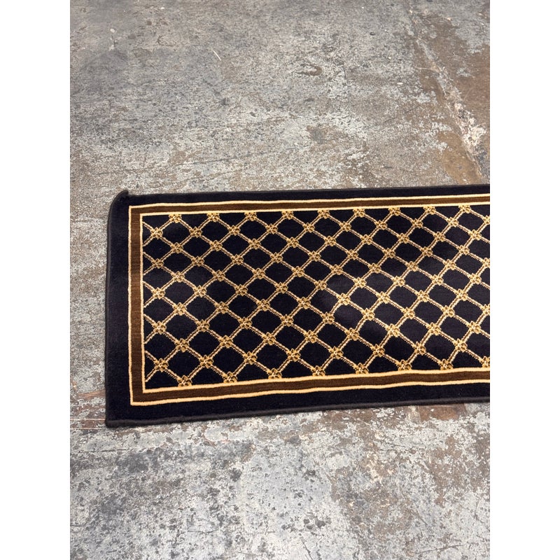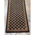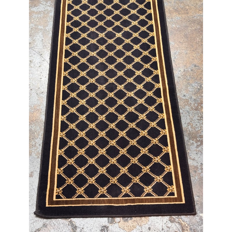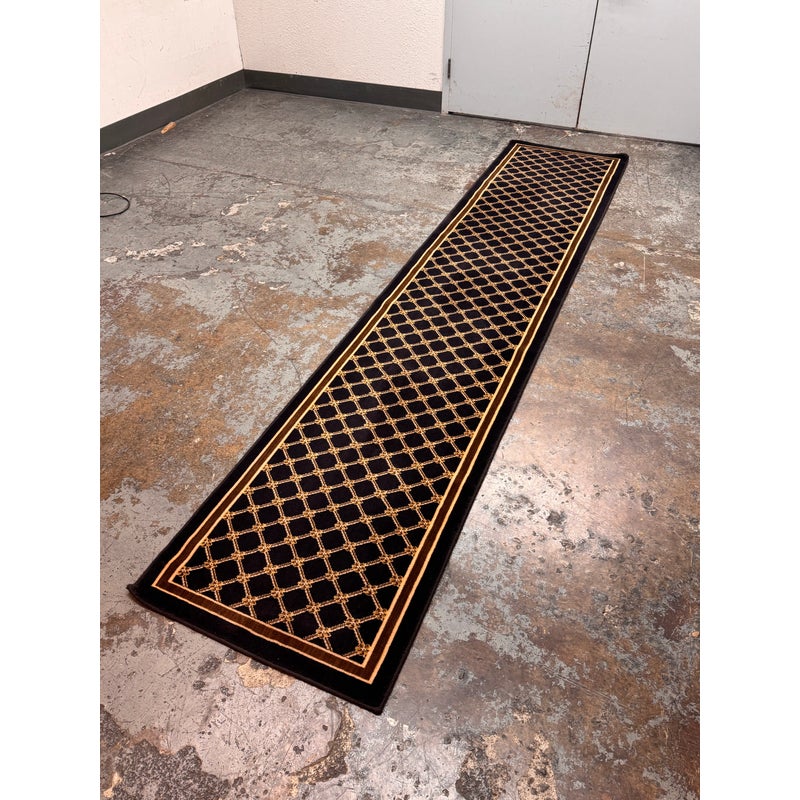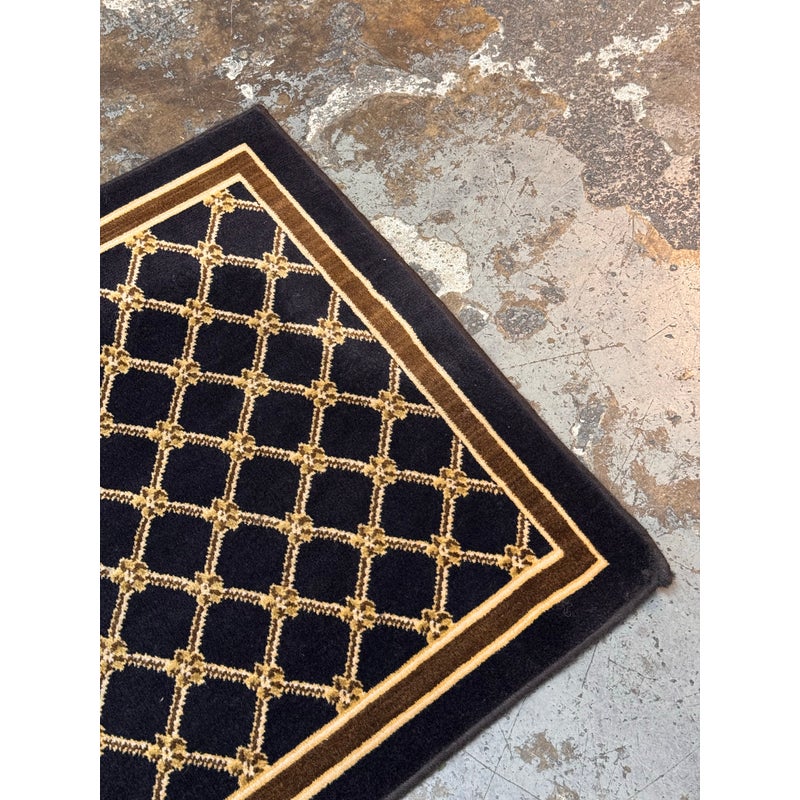 Design Plus Gallery presents a 2ft 7in × 9ft 6in Karastan Wool Runner Rug. This Karastan runner is woven in wool with a black ground and an allover gold lattice pattern, framed by a coordinating double border for a tailored look. The pile feels smooth underfoot and the edges are neatly secured for a long lasting profile. It is in good condition with visible and minimal wear from usage. Made in the USA.