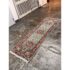 Design Plus Gallery presents a 2ft 9in × 8ft 3inVintage Wool Runner Rug. This narrow runner rug showcases a series of geometric medallions set along a muted sage green ground, framed by a navy border with coral, ivory, and soft green accents. The pattern includes small stylized motifs throughout, finished with short fringe at both ends. The palette blends cool greens with deep navy and lively coral tones for a balanced, graphic look. It is in good condition with visible and minimal wear from usage.