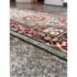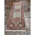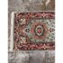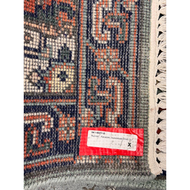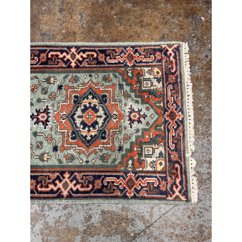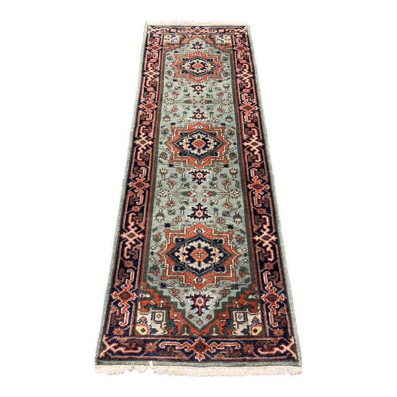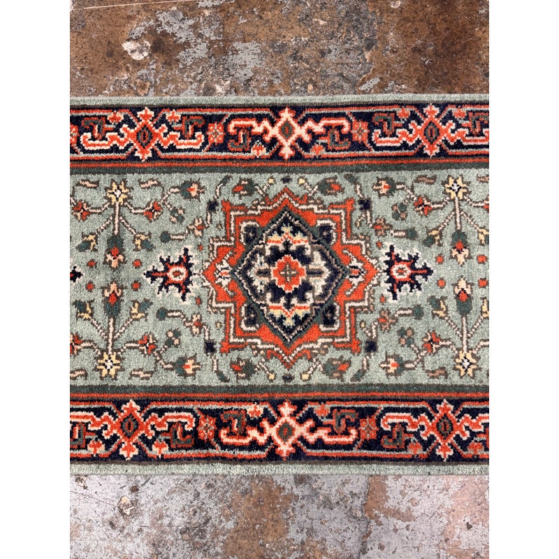 Design Plus Gallery presents a 2ft 9in × 8ft 3inVintage Wool Runner Rug. This narrow runner rug showcases a series of geometric medallions set along a muted sage green ground, framed by a navy border with coral, ivory, and soft green accents. The pattern includes small stylized motifs throughout, finished with short fringe at both ends. The palette blends cool greens with deep navy and lively coral tones for a balanced, graphic look. It is in good condition with visible and minimal wear from usage.