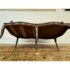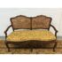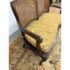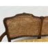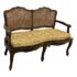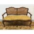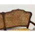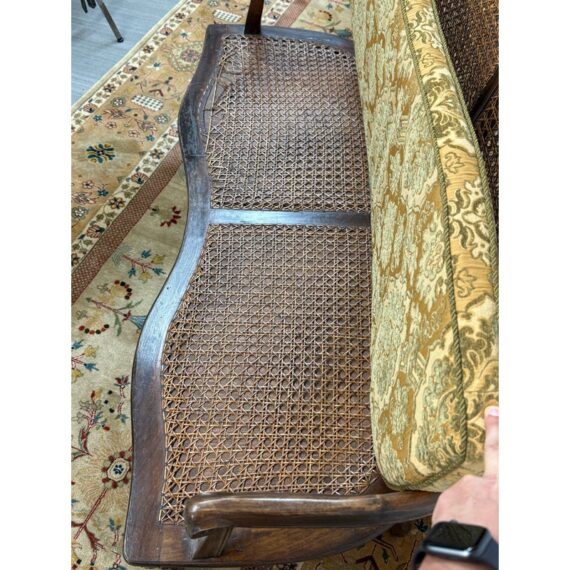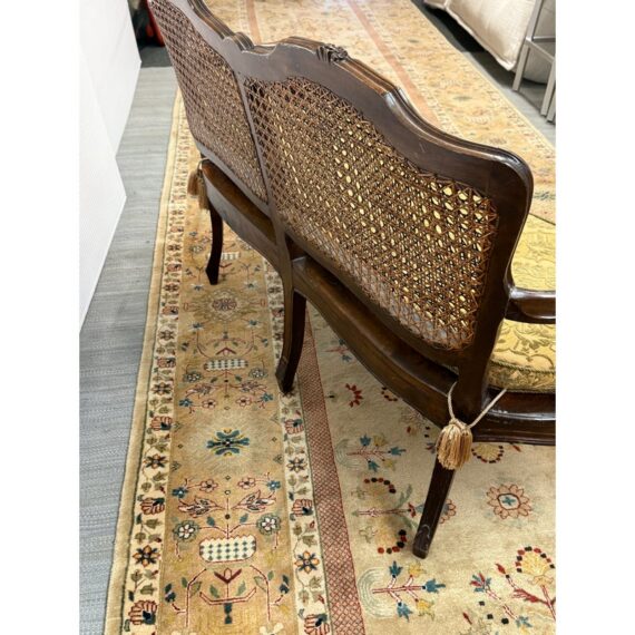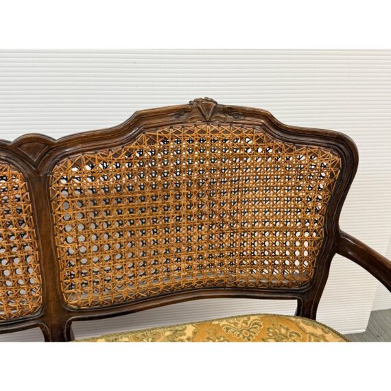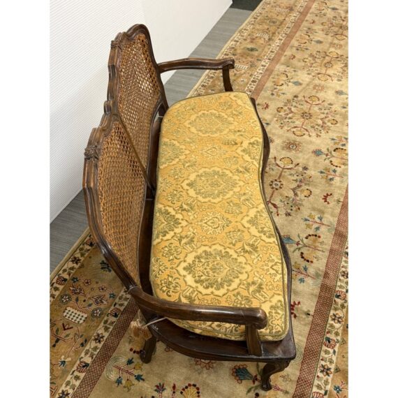 Design Plus Gallery presents a French Cane Back Sofa Bench from the 20th Century. The leg, arms and back rest have beautiful millwork, as well as the cane back. This settee or canapé is characterized by its light, breathable hand-woven cane panels and elegantly carved wood frame. It draws from historical Louis XV and Louis XVI styles, featuring motifs such as floral carvings and cabriole legs. There is a loose bench seat cushion that has a Golden Damask Chenille upholstery that suits its old-world style. There is cane under the seat cushion that has been restored with wood planks in the same stain to fix the broken cane work and make the bench strong + function.