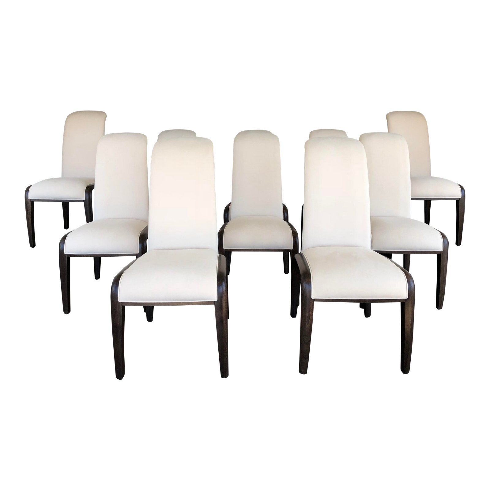 Design Plus Gallery presents a dramatic set of dining chairs. Modern and contemporary, the swooping silhouette of the ten Pietro Constantini chairs are crafted in dark hardwoods and ivory microfiber over foam. Chairs are missing the undersea mesh. Seat Height: 19 inches