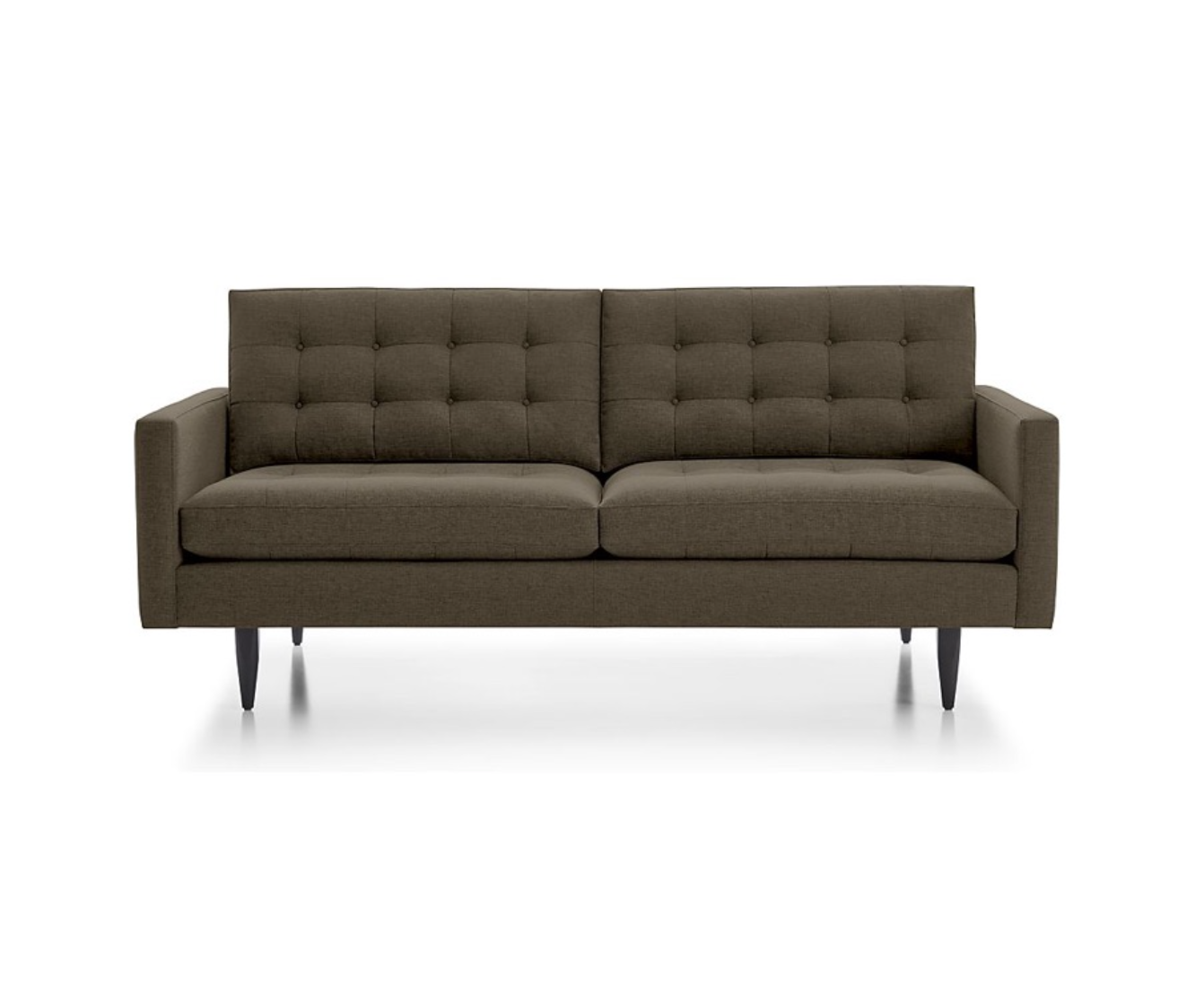 Design Plus Consignment Gallery has a Petrie Apartment Sofa from Crate & Barrel. The Petrie is a classic mid-century modern design, with clean lines and tailored cushions. It lets you sit deep firm and upright, but also slouch back in comfort. Scaled for apartment living and small rooms. Features sleek, boxy cushions and slim track arms that are tailored in Bark Color upholstery. The legs are in a dark finish. Made in North Carolina, USA. Original Price: $1,800.