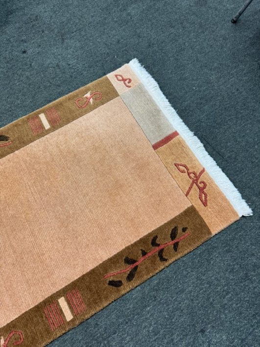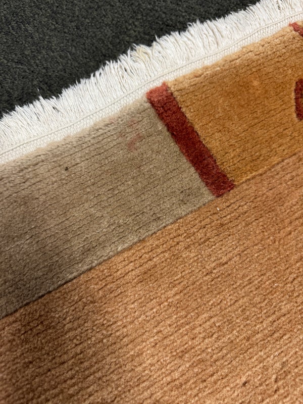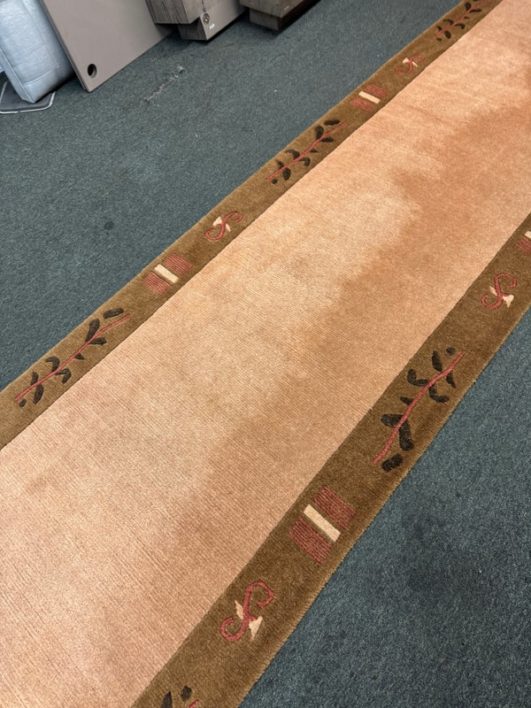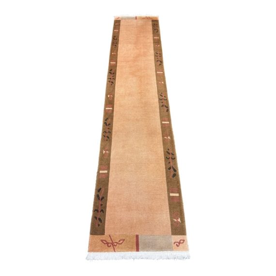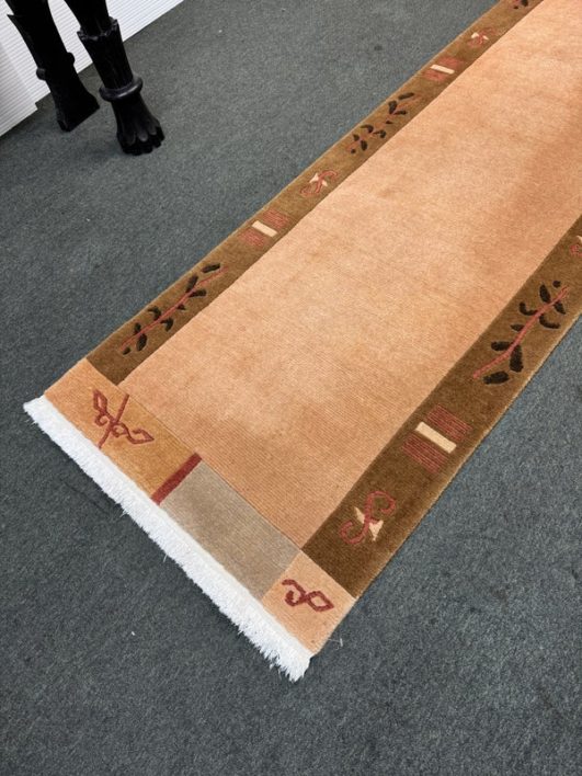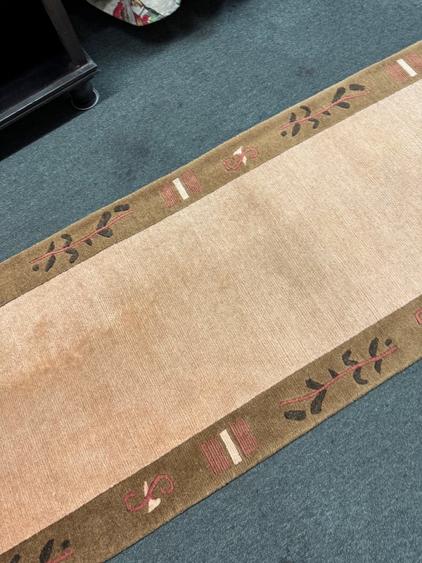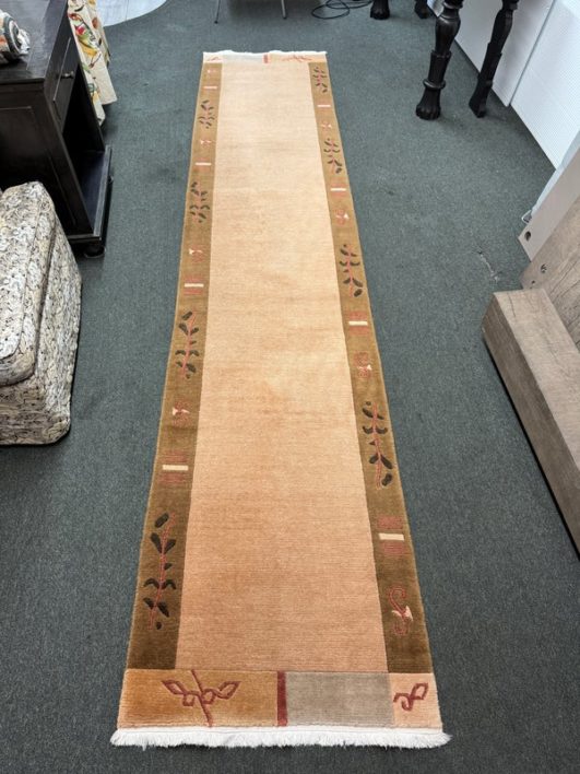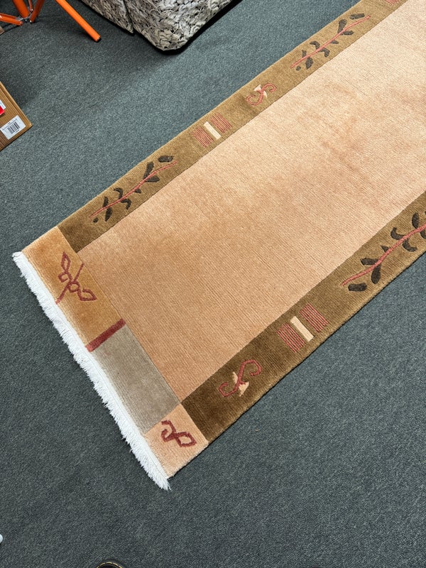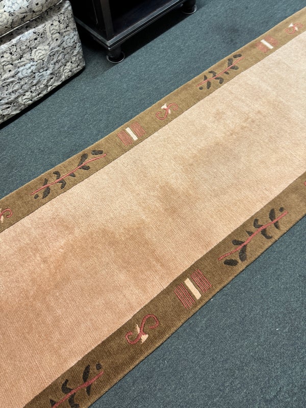 Design Plus Gallery presents a 2ft 6in X 11ft 10in Runner Rug of Nepalese Origin. Handmade the rug is simple, elegant and eye-catching. Transistional style rug with Brown, Cream, Khaki accent colors. Imported from Nepal and crafted using the finest weaving techniques. Hand-knotted and constructed from 100% Wool with Cotton foundation. Is in good condition with wear that is consistent with its age + use.