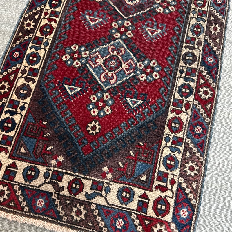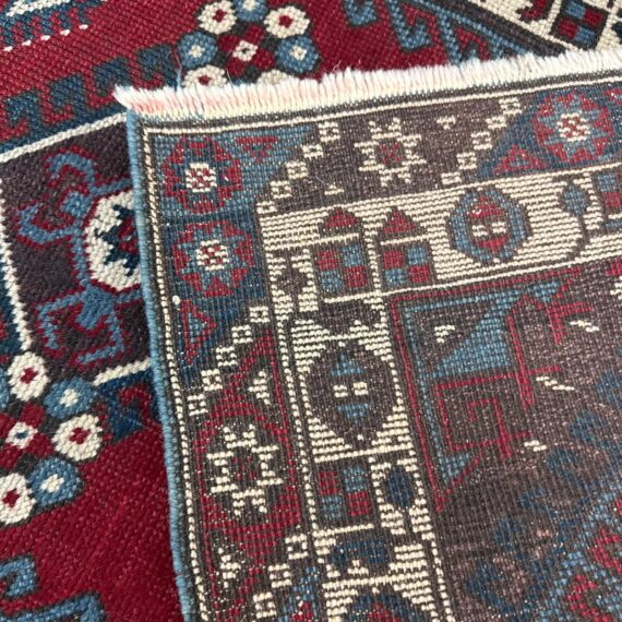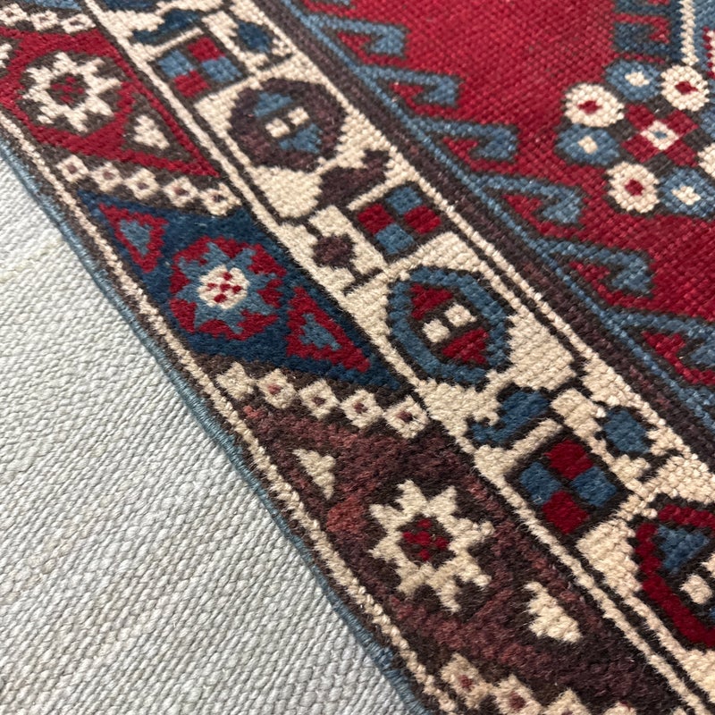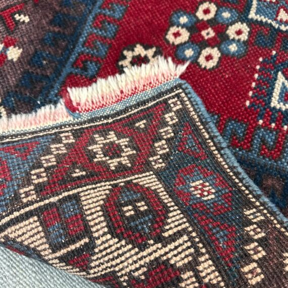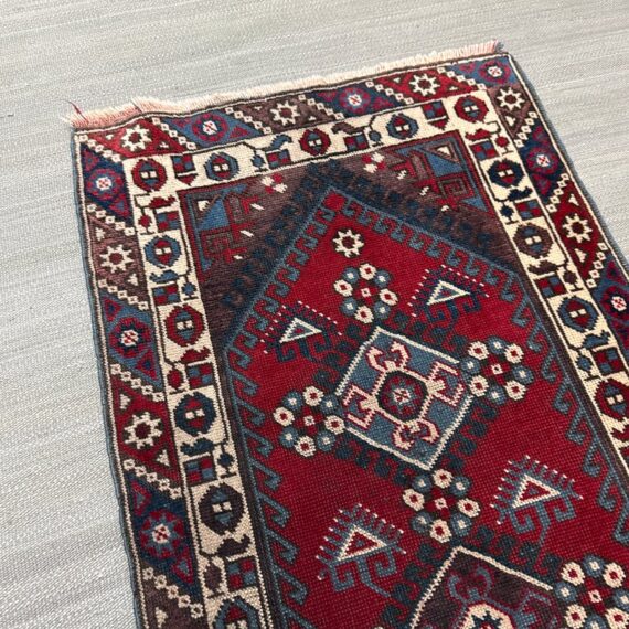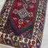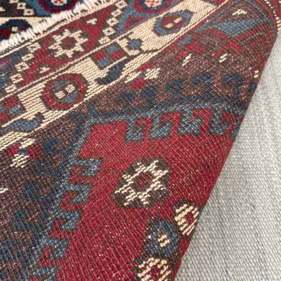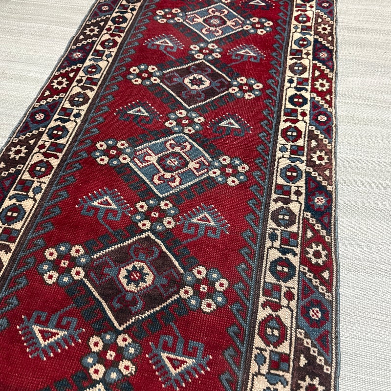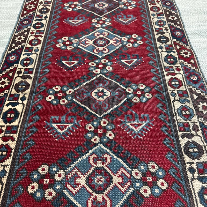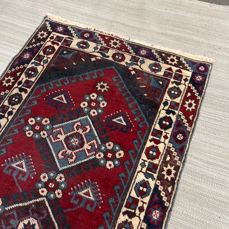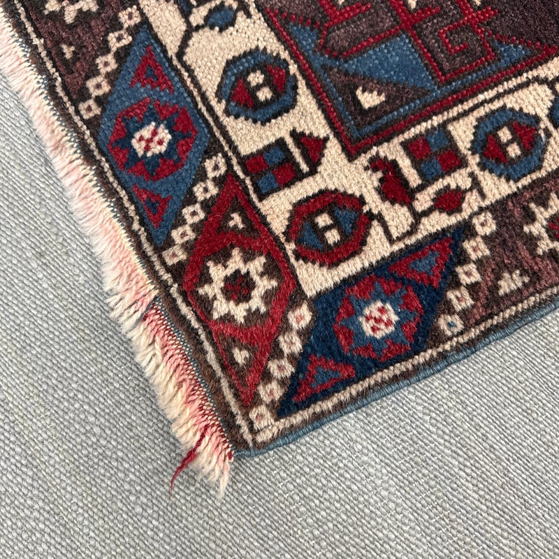 Design Plus Gallery presents a 2ft 8inch × 9ft 8in Hamadan Runner. The rug offers a foundation of colors underfoot such as deep red, blue and gray with a tribal pattern in natural, with a red and blue border. These colors + patterns are strong and dramatic. Light surface wear with fringe is damaged, as shown.