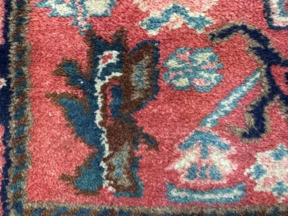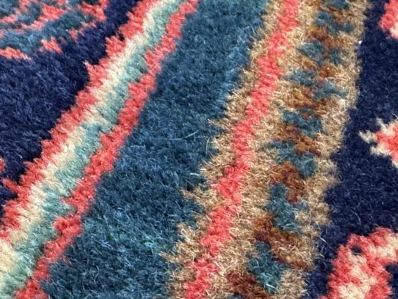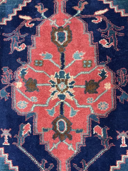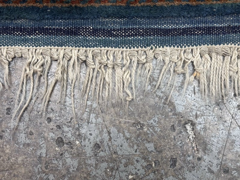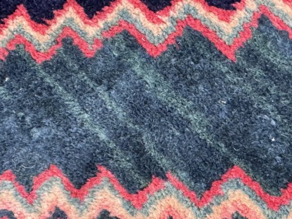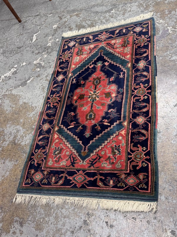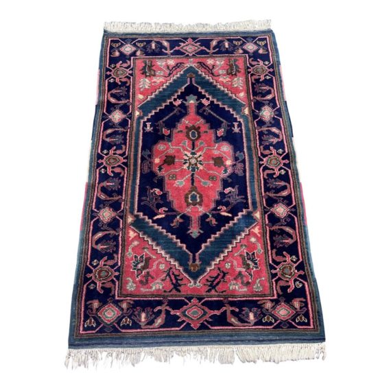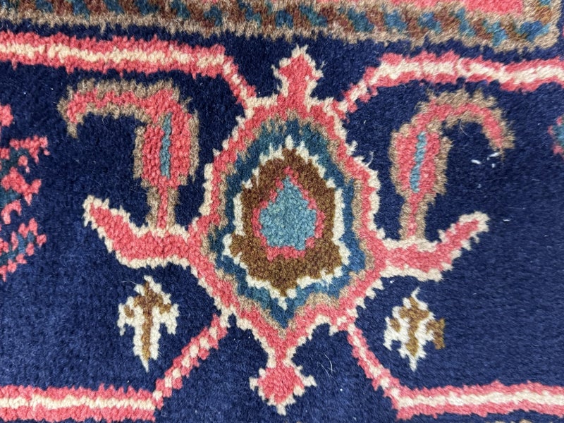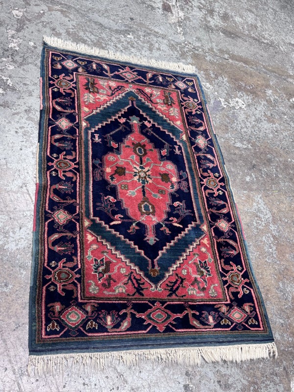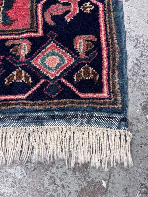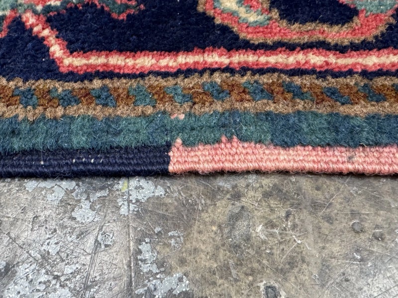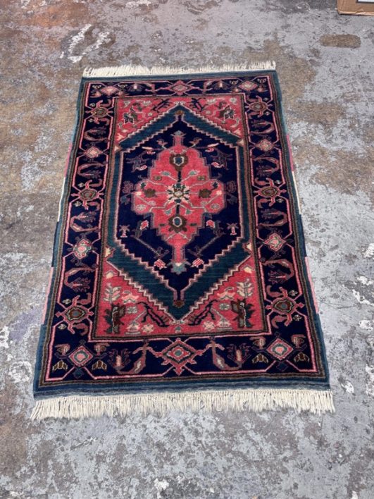 Design Plus Gallery presents a petite 3ft x 5ft Afshar Area Rug. The rug features old world charm and high end design that is awakened by over-dyed, rich colors. Masterful, sharp designs are complimented by hand stitched edges and a soft backing, for a refined and timeless look that is at home in a myriad of spaces. The rug has deep colors from penetrating blues with rose tones amongst other breathtaking colors. The hand knotted rug does show signs of wear but is in good condition for its age + use.