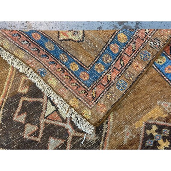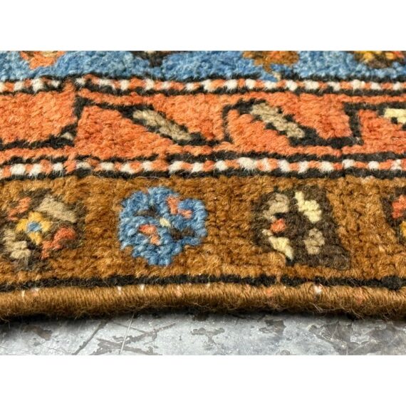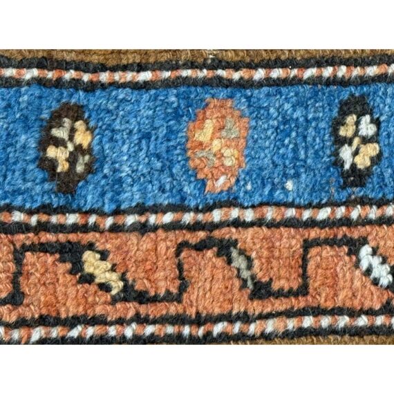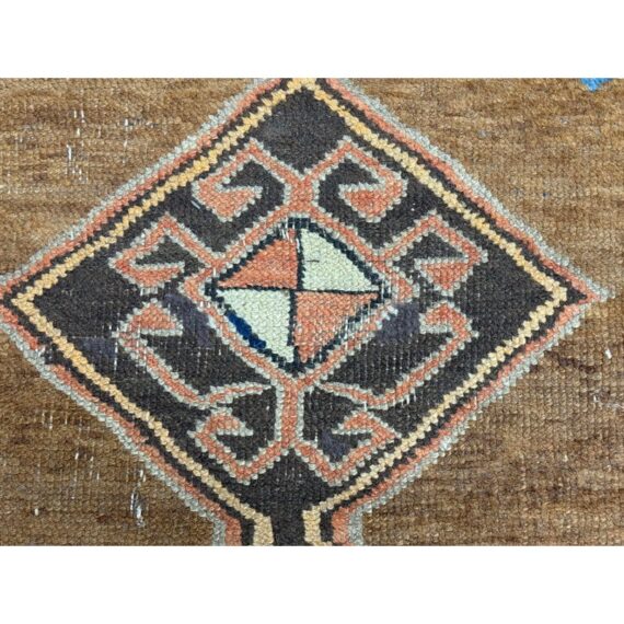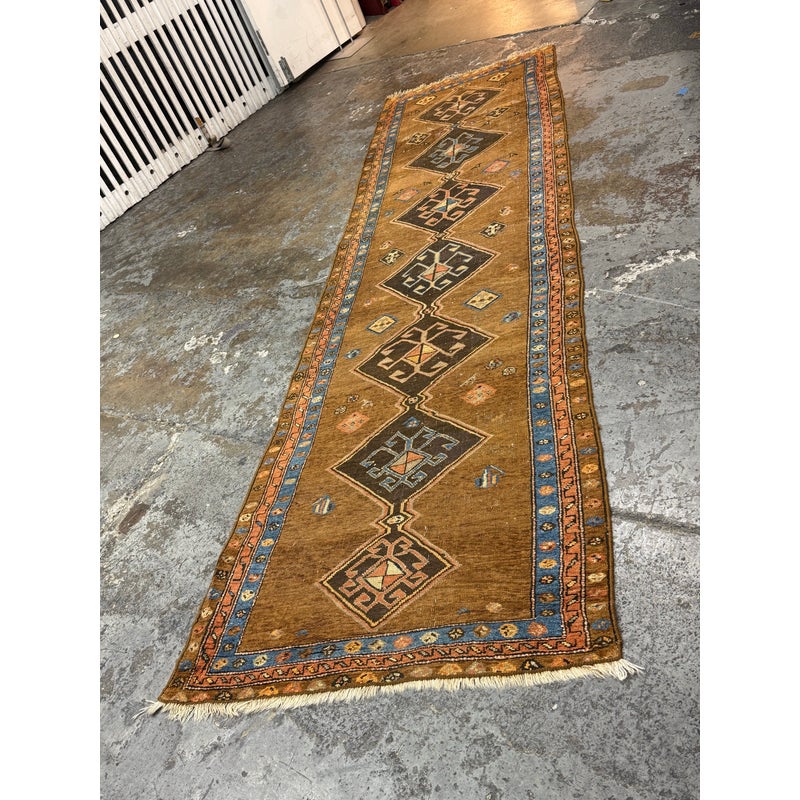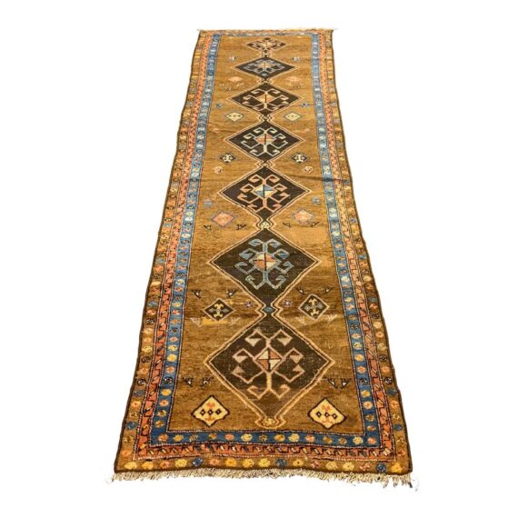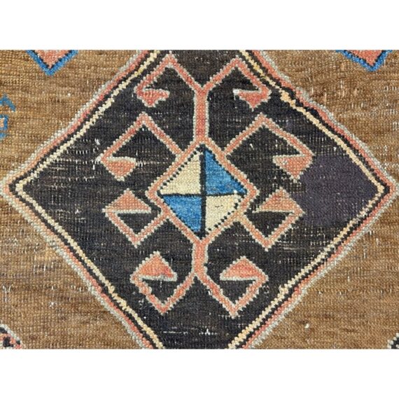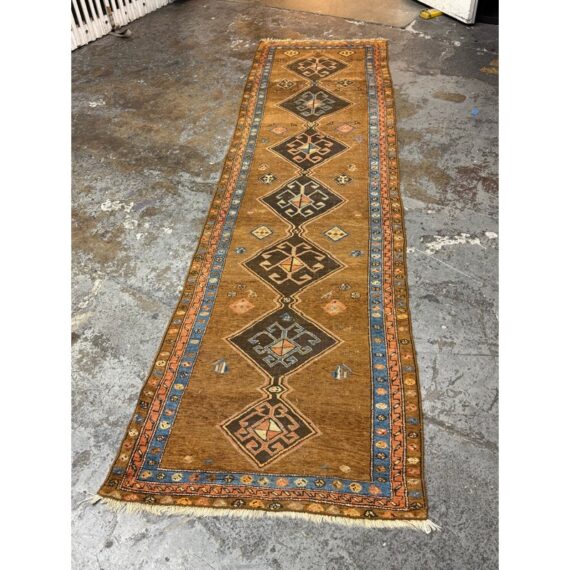 Design Plus Gallery presents the Perfect Hallway Area Rug at 3ft 3in x 12ft of Kazak Orient. An exquisite find with its ornamentation of repeating center medallions in differing colors. Three strongly embellished borders of pink, blue and tan end with its hand knotted fringe. The runner is in good condition with minimal surface wear for its usage.